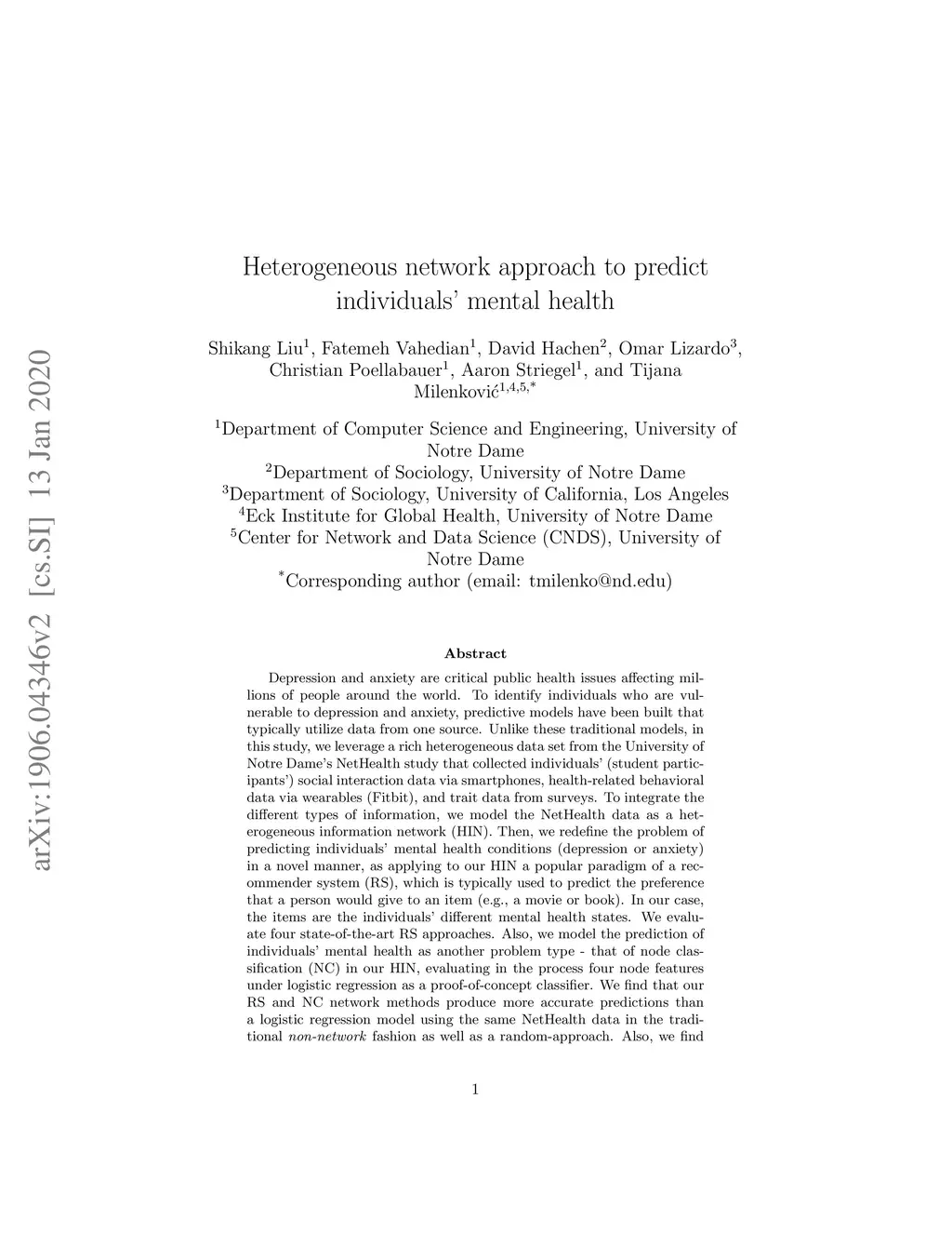 Heterogeneous network approach to predict individuals' mental health