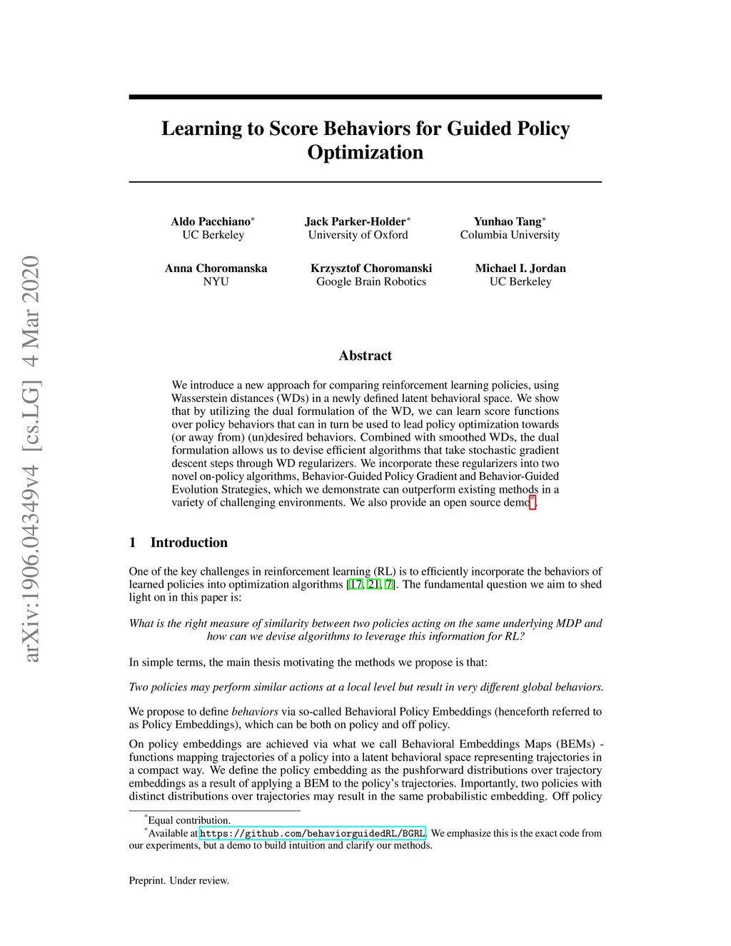 We introduce a new approach for comparing reinforcement learning policies, using Wasserstein distances (WDs) in a newly defined latent behavioral space. We show that by utilizing the dual formulation of the WD, we can learn score functions over policy behaviors that can in turn be used to lead policy optimization towards (or away from) (un)desired behaviors. Combined with smoothed WDs, the dual formulation allows us to devise efficient algorithms that take stochastic gradient descent steps through WD regularizers. We incorporate these regularizers into two novel on-policy algorithms, Behavior-Guided Policy Gradient and Behavior-Guided Evolution Strategies, which we demonstrate can outperform existing methods in a variety of challenging environments. We also provide an open source demo.