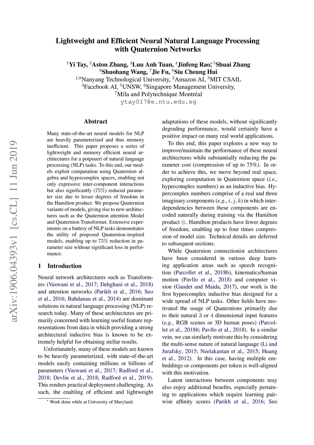 Many state-of-the-art neural models for NLP are heavily parameterized and thus memory inefficient. This paper proposes a series of lightweight and memory efficient neural architectures for a potpourri of natural language processing (NLP) tasks. To this end, our models exploit computation using Quaternion algebra and hypercomplex spaces, enabling not only expressive inter-component interactions but also significantly () reduced parameter size due to lesser degrees of freedom in the Hamilton product. We propose Quaternion variants of models, giving rise to new architectures such as the Quaternion attention Model and Quaternion Transformer. Extensive experiments on a battery of NLP tasks demonstrates the utility of proposed Quaternion-inspired models, enabling up to reduction in parameter size without significant loss in performance.