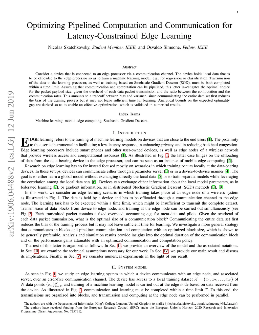 Consider a device that is connected to an edge processor via a communication channel. The device holds local data that is to be offloaded to the edge processor so as to train a machine learning model, e.g., for regression or classification. Transmission of the data to the learning processor, as well as training based on Stochastic Gradient Descent (SGD), must be both completed within a time limit. Assuming that communication and computation can be pipelined, this letter investigates the optimal choice for the packet payload size, given the overhead of each data packet transmission and the ratio between the computation and the communication rates. This amounts to a tradeoff between bias and variance, since communicating the entire data set first reduces the bias of the training process but it may not leave sufficient time for learning. Analytical bounds on the expected optimality gap are derived so as to enable an effective optimization, which is validated in numerical results.