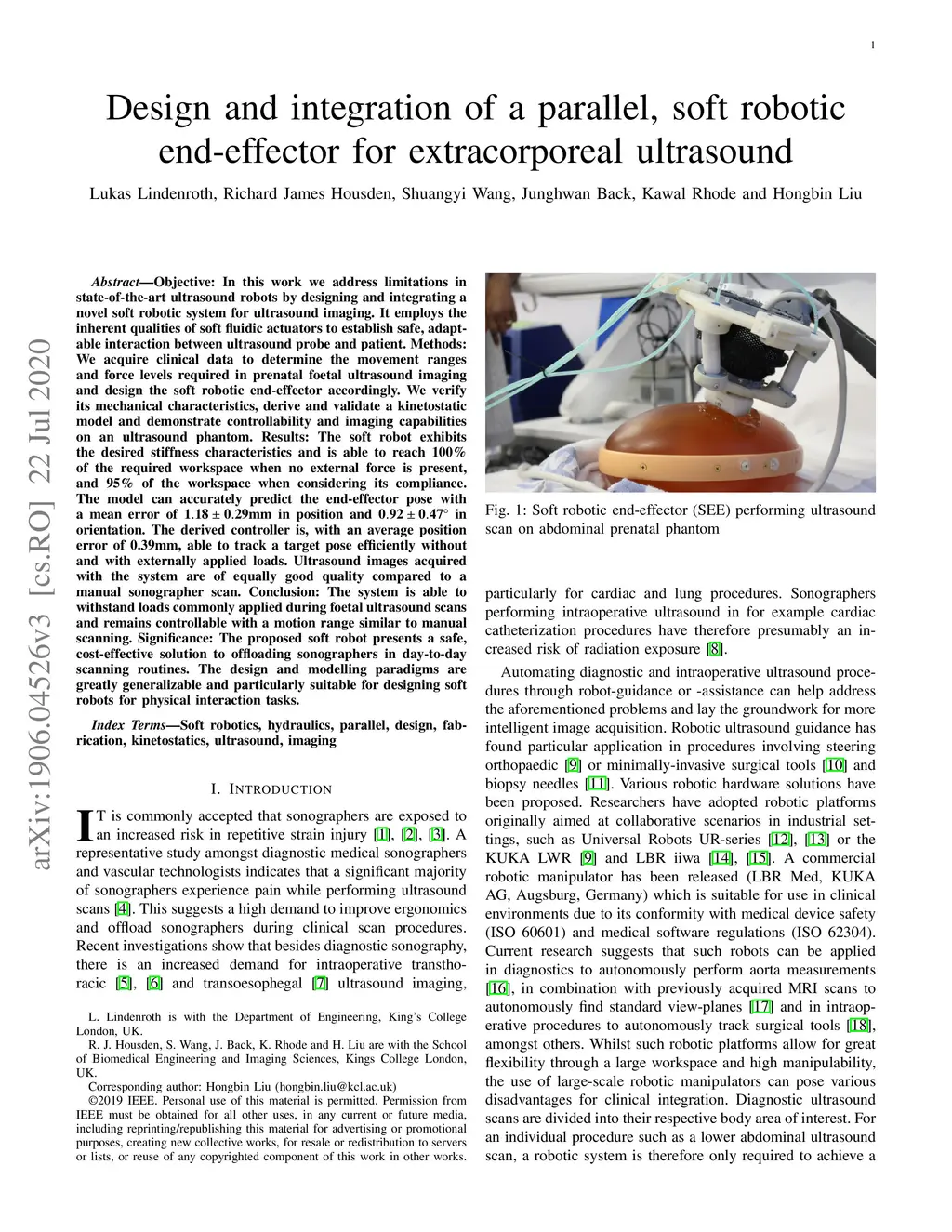 Objective: In this work we address limitations in state-of-the-art ultrasound robots by designing and integrating a novel soft robotic system for ultrasound imaging. It employs the inherent qualities of soft fluidic actuators to establish safe, adaptable interaction between ultrasound probe and patient. Methods: We acquire clinical data to determine the movement ranges and force levels required in prenatal foetal ultrasound imaging and design the soft robotic end-effector accordingly. We verify its mechanical characteristics, derive and validate a kinetostatic model and demonstrate controllability and imaging capabilities on an ultrasound phantom. Results: The soft robot exhibits the desired stiffness characteristics and is able to reach 100% of the required workspace when no external force is present, and 95% of the workspace when considering its compliance. The model can accurately predict the end-effector pose with a mean error of 1.18+/-0.29mm in position and 0.92+/-0.47deg in orientation. The derived controller is, with an average position error of 0.39mm, able to track a target pose efficiently without and with externally applied loads. Ultrasound images acquired with the system are of equally good quality compared to a manual sonographer scan. Conclusion: The system is able to withstand loads commonly applied during foetal ultrasound scans and remains controllable with a motion range similar to manual scanning. Significance: The proposed soft robot presents a safe, cost-effective solution to offloading sonographers in day-to-day scanning routines. The design and modelling paradigms are greatly generalizable and particularly suitable for designing soft robots for physical interaction tasks.