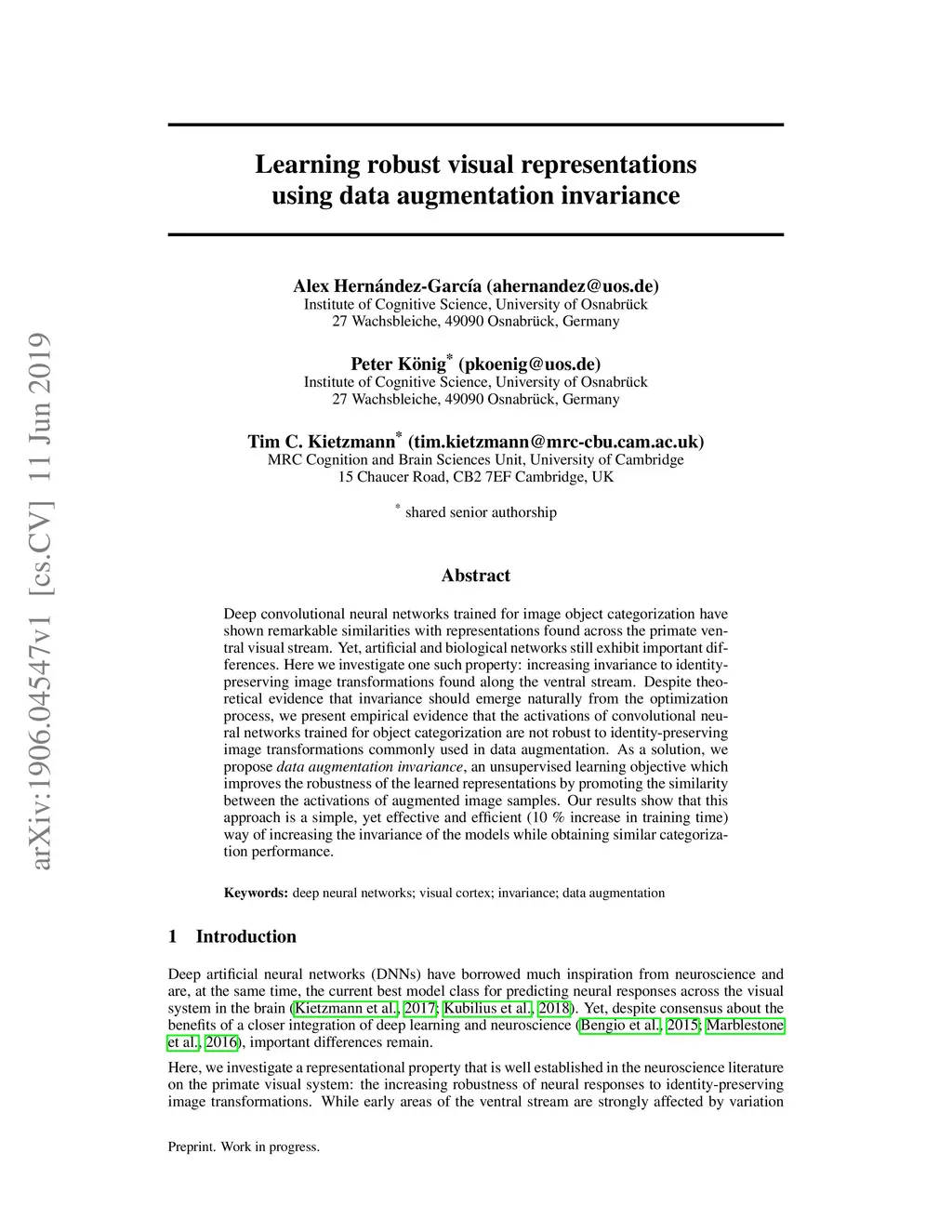 Deep convolutional neural networks trained for image object categorization have shown remarkable similarities with representations found across the primate ventral visual stream. Yet, artificial and biological networks still exhibit important differences. Here we investigate one such property: increasing invariance to identity-preserving image transformations found along the ventral stream. Despite theoretical evidence that invariance should emerge naturally from the optimization process, we present empirical evidence that the activations of convolutional neural networks trained for object categorization are not robust to identity-preserving image transformations commonly used in data augmentation. As a solution, we propose data augmentation invariance, an unsupervised learning objective which improves the robustness of the learned representations by promoting the similarity between the activations of augmented image samples. Our results show that this approach is a simple, yet effective and efficient (10 % increase in training time) way of increasing the invariance of the models while obtaining similar categorization performance.
