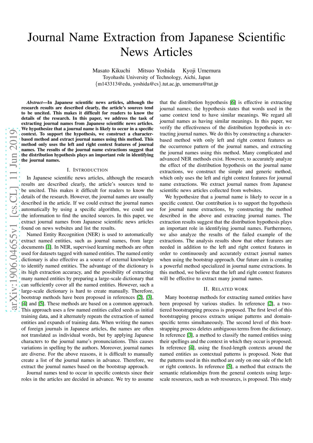 In Japanese scientific news articles, although the research results are described clearly, the article's sources tend to be uncited. This makes it difficult for readers to know the details of the research. In this paper, we address the task of extracting journal names from Japanese scientific news articles. We hypothesize that a journal name is likely to occur in a specific context. To support the hypothesis, we construct a character-based method and extract journal names using this method. This method only uses the left and right context features of journal names. The results of the journal name extractions suggest that the distribution hypothesis plays an important role in identifying the journal names.