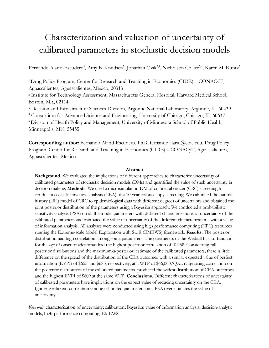 We evaluated the implications of different approaches to characterize uncertainty of calibrated parameters of stochastic decision models (DMs) in the quantified value of such uncertainty in decision making. We used a microsimulation DM of colorectal cancer (CRC) screening to conduct a cost-effectiveness analysis (CEA) of a 10-year colonoscopy screening. We calibrated the natural history model of CRC to epidemiological data with different degrees of uncertainty and obtained the joint posterior distribution of the parameters using a Bayesian approach. We conducted a probabilistic sensitivity analysis (PSA) on all the model parameters with different characterizations of uncertainty of the calibrated parameters and estimated the value of uncertainty of the different characterizations with a value of information analysis. All analyses were conducted using high performance computing resources running the Extreme-scale Model Exploration with Swift (EMEWS) framework. The posterior distribution had high correlation among some parameters. The parameters of the Weibull hazard function for the age of onset of adenomas had the highest posterior correlation of -0.958. Considering full posterior distributions and the maximum-a-posteriori estimate of the calibrated parameters, there is little difference on the spread of the distribution of the CEA outcomes with a similar expected value of perfect information (EVPI) of \653 and \685, respectively, at a WTP of \66,000/QALY. Ignoring correlation on the posterior distribution of the calibrated parameters, produced the widest distribution of CEA outcomes and the highest EVPI of \809 at the same WTP. Different characterizations of uncertainty of calibrated parameters have implications on the expect value of reducing uncertainty on the CEA. Ignoring inherent correlation among calibrated parameters on a PSA overestimates the value of uncertainty.