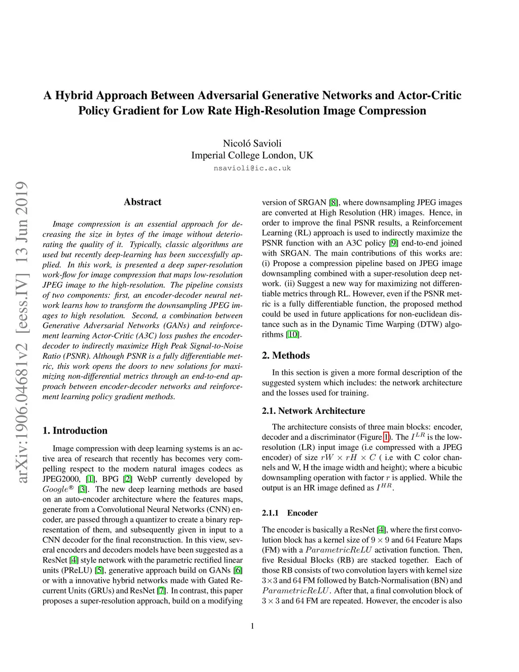 Image compression is an essential approach for decreasing the size in bytes of the image without deteriorating the quality of it. Typically, classic algorithms are used but recently deep-learning has been successfully applied. In this work, is presented a deep super-resolution work-flow for image compression that maps low-resolution JPEG image to the high-resolution. The pipeline consists of two components: first, an encoder-decoder neural network learns how to transform the downsampling JPEG images to high resolution. Second, a combination between Generative Adversarial Networks (GANs) and reinforcement learning Actor-Critic (A3C) loss pushes the encoder-decoder to indirectly maximize High Peak Signal-to-Noise Ratio (PSNR). Although PSNR is a fully differentiable metric, this work opens the doors to new solutions for maximizing non-differential metrics through an end-to-end approach between encoder-decoder networks and reinforcement learning policy gradient methods.