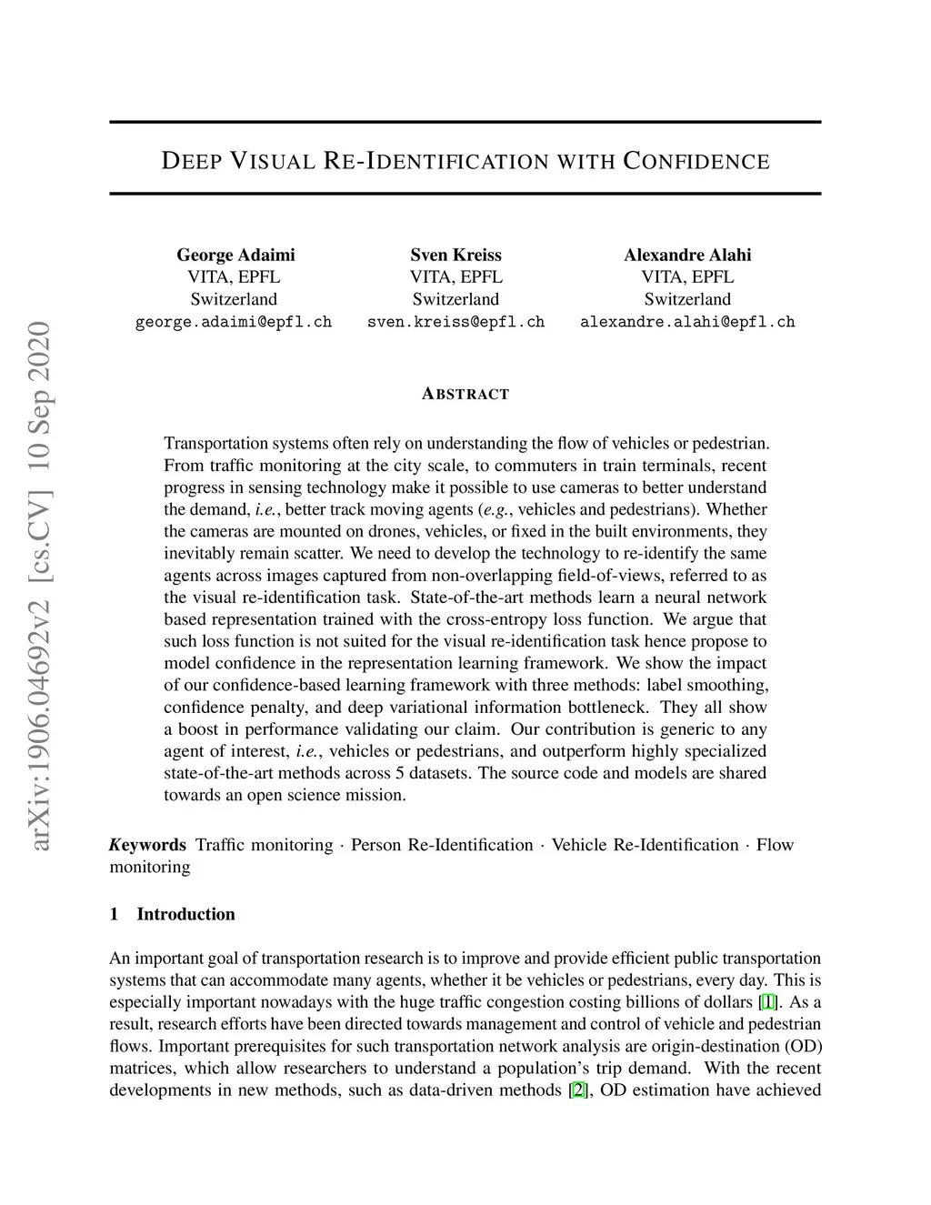 Transportation systems often rely on understanding the flow of vehicles or pedestrian. From traffic monitoring at the city scale, to commuters in train terminals, recent progress in sensing technology make it possible to use cameras to better understand the demand, i.e., better track moving agents (e.g., vehicles and pedestrians). Whether the cameras are mounted on drones, vehicles, or fixed in the built environments, they inevitably remain scatter. We need to develop the technology to re-identify the same agents across images captured from non-overlapping field-of-views, referred to as the visual re-identification task. State-of-the-art methods learn a neural network based representation trained with the cross-entropy loss function. We argue that such loss function is not suited for the visual re-identification task hence propose to model confidence in the representation learning framework. We show the impact of our confidence-based learning framework with three methods: label smoothing, confidence penalty, and deep variational information bottleneck. They all show a boost in performance validating our claim. Our contribution is generic to any agent of interest, i.e., vehicles or pedestrians, and outperform highly specialized state-of-the-art methods across 5 datasets. The source code and models are shared towards an open science mission.