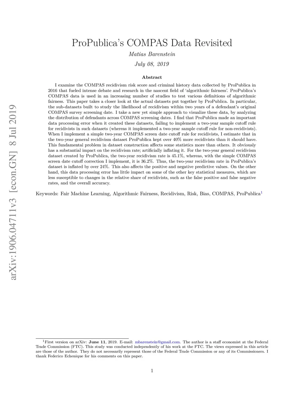 I examine the COMPAS recidivism risk score and criminal history data collected by ProPublica in 2016 that fueled intense debate and research in the nascent field of álgorithmic fairness'. ProPublica's COMPAS data is used in an increasing number of studies to test various definitions of algorithmic fairness. This paper takes a closer look at the actual datasets put together by ProPublica. In particular, the sub-datasets built to study the likelihood of recidivism within two years of a defendant's original COMPAS survey screening date. I take a new yet simple approach to visualize these data, by analyzing the distribution of defendants across COMPAS screening dates. I find that ProPublica made an important data processing error when it created these datasets, failing to implement a two-year sample cutoff rule for recidivists in such datasets (whereas it implemented a two-year sample cutoff rule for non-recidivists). When I implement a simple two-year COMPAS screen date cutoff rule for recidivists, I estimate that in the two-year general recidivism dataset ProPublica kept over 40% more recidivists than it should have. This fundamental problem in dataset construction affects some statistics more than others. It obviously has a substantial impact on the recidivism rate; artificially inflating it. For the two-year general recidivism dataset created by ProPublica, the two-year recidivism rate is 45.1%, whereas, with the simple COMPAS screen date cutoff correction I implement, it is 36.2%. Thus, the two-year recidivism rate in ProPublica's dataset is inflated by over 24%. This also affects the positive and negative predictive values. On the other hand, this data processing error has little impact on some of the other key statistical measures, which are less susceptible to changes in the relative share of recidivists, such as the false positive and false negative rates, and the overall accuracy.