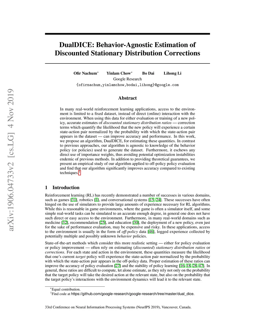 DualDICE: Behavior-Agnostic Estimation of Discounted Stationary