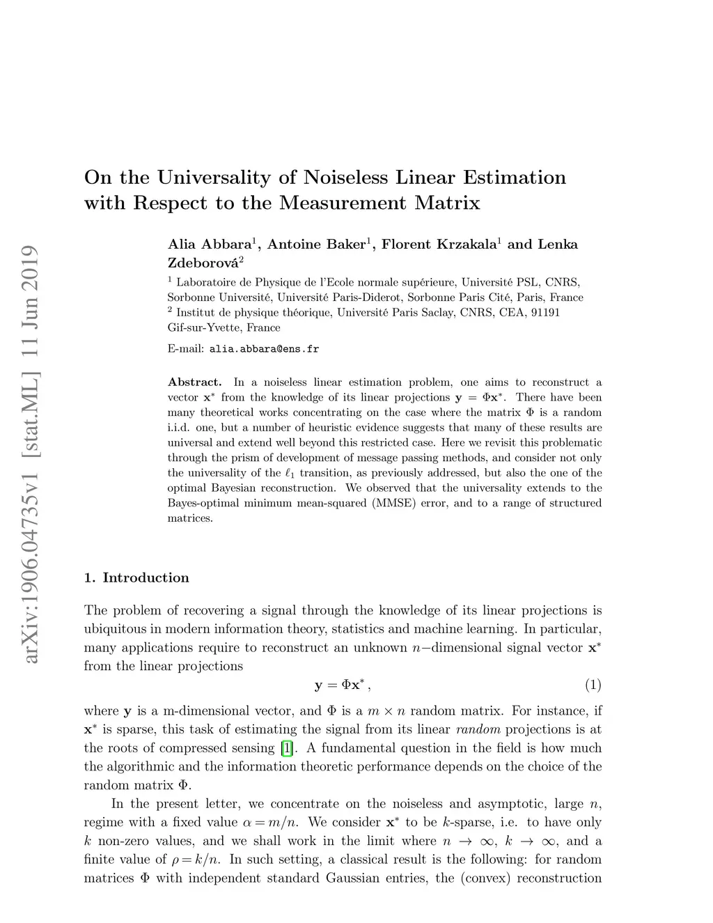 In a noiseless linear estimation problem, one aims to reconstruct a vector x* from the knowledge of its linear projections y=Phi x*. There have been many theoretical works concentrating on the case where the matrix Phi is a random i.i.d. one, but a number of heuristic evidence suggests that many of these results are universal and extend well beyond this restricted case. Here we revisit this problematic through the prism of development of message passing methods, and consider not only the universality of the l1 transition, as previously addressed, but also the one of the optimal Bayesian reconstruction. We observed that the universality extends to the Bayes-optimal minimum mean-squared (MMSE) error, and to a range of structured matrices.