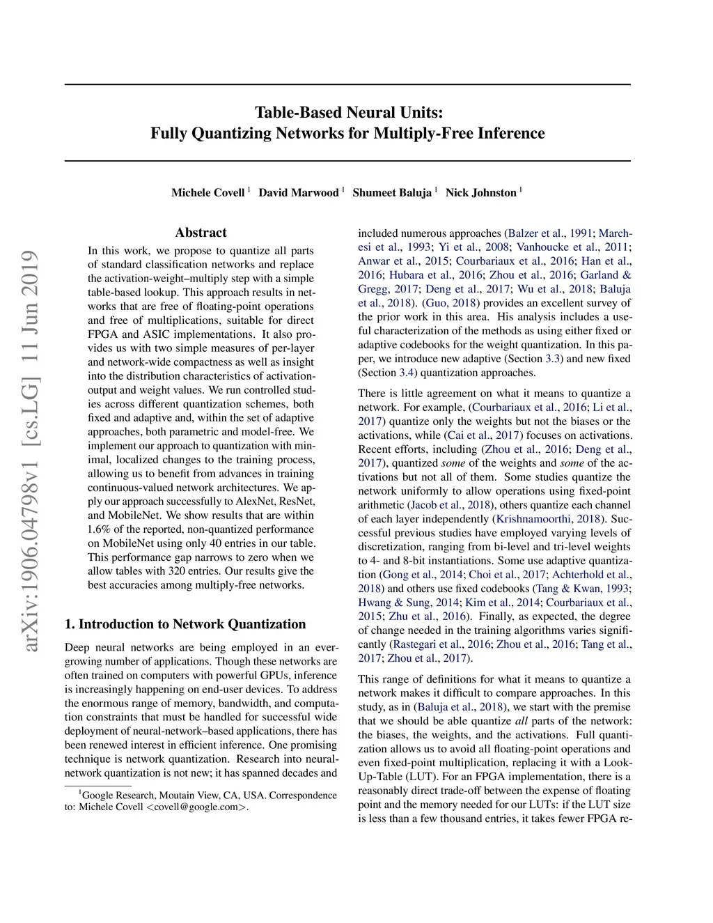 In this work, we propose to quantize all parts of standard classification networks and replace the activation-weight--multiply step with a simple table-based lookup. This approach results in networks that are free of floating-point operations and free of multiplications, suitable for direct FPGA and ASIC implementations. It also provides us with two simple measures of per-layer and network-wide compactness as well as insight into the distribution characteristics of activationoutput and weight values. We run controlled studies across different quantization schemes, both fixed and adaptive and, within the set of adaptive approaches, both parametric and model-free. We implement our approach to quantization with minimal, localized changes to the training process, allowing us to benefit from advances in training continuous-valued network architectures. We apply our approach successfully to AlexNet, ResNet, and MobileNet. We show results that are within 1.6% of the reported, non-quantized performance on MobileNet using only 40 entries in our table. This performance gap narrows to zero when we allow tables with 320 entries. Our results give the best accuracies among multiply-free networks.