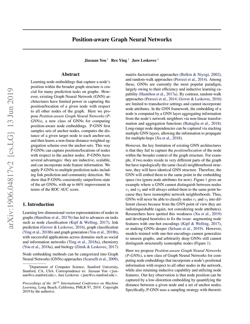 Learning node embeddings that capture a node's position within the broader graph structure is crucial for many prediction tasks on graphs. However, existing Graph Neural Network (GNN) architectures have limited power in capturing the position/location of a given node with respect to all other nodes of the graph. Here we propose Position-aware Graph Neural Networks (P-GNNs), a new class of GNNs for computing position-aware node embeddings. P-GNN first samples sets of anchor nodes, computes the distance of a given target node to each anchor-set,and then learns a non-linear distance-weighted aggregation scheme over the anchor-sets. This way P-GNNs can capture positions/locations of nodes with respect to the anchor nodes. P-GNNs have several advantages: they are inductive, scalable,and can incorporate node feature information. We apply P-GNNs to multiple prediction tasks including link prediction and community detection. We show that P-GNNs consistently outperform state of the art GNNs, with up to 66% improvement in terms of the ROC AUC score.