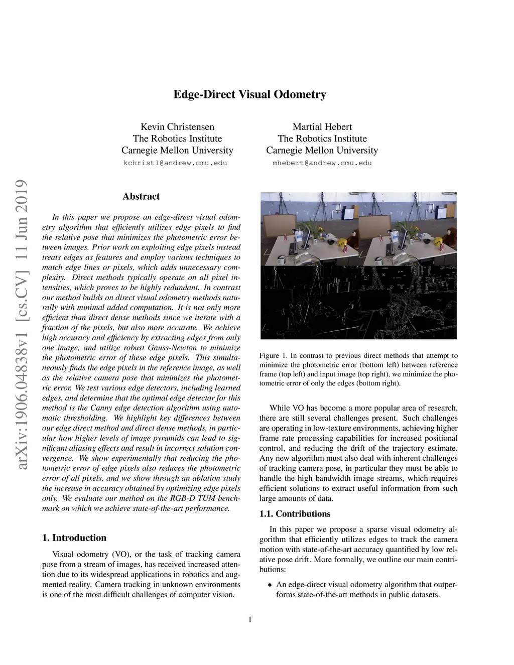 In this paper we propose an edge-direct visual odometry algorithm that efficiently utilizes edge pixels to find the relative pose that minimizes the photometric error between images. Prior work on exploiting edge pixels instead treats edges as features and employ various techniques to match edge lines or pixels, which adds unnecessary complexity. Direct methods typically operate on all pixel intensities, which proves to be highly redundant. In contrast our method builds on direct visual odometry methods naturally with minimal added computation. It is not only more efficient than direct dense methods since we iterate with a fraction of the pixels, but also more accurate. We achieve high accuracy and efficiency by extracting edges from only one image, and utilize robust Gauss-Newton to minimize the photometric error of these edge pixels. This simultaneously finds the edge pixels in the reference image, as well as the relative camera pose that minimizes the photometric error. We test various edge detectors, including learned edges, and determine that the optimal edge detector for this method is the Canny edge detection algorithm using automatic thresholding. We highlight key differences between our edge direct method and direct dense methods, in particular how higher levels of image pyramids can lead to significant aliasing effects and result in incorrect solution convergence. We show experimentally that reducing the photometric error of edge pixels also reduces the photometric error of all pixels, and we show through an ablation study the increase in accuracy obtained by optimizing edge pixels only. We evaluate our method on the RGB-D TUM benchmark on which we achieve state-of-the-art performance.