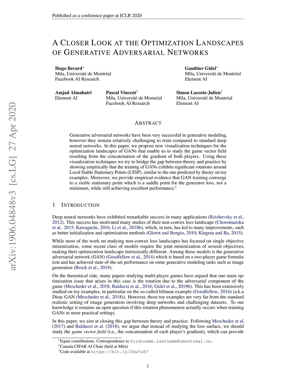 Generative adversarial networks have been very successful in generative modeling, however they remain relatively challenging to train compared to standard deep neural networks. In this paper, we propose new visualization techniques for the optimization landscapes of GANs that enable us to study the game vector field resulting from the concatenation of the gradient of both players. Using these visualization techniques we try to bridge the gap between theory and practice by showing empirically that the training of GANs exhibits significant rotations around Local Stable Stationary Points (LSSP), similar to the one predicted by theory on toy examples. Moreover, we provide empirical evidence that GAN training converge to a stable stationary point which is a saddle point for the generator loss, not a minimum, while still achieving excellent performance.