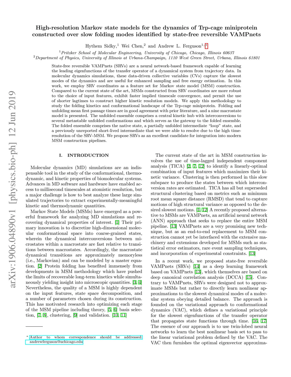State-free reversible VAMPnets (SRVs) are a neural network-based framework capable of learning the leading eigenfunctions of the transfer operator of a dynamical system from trajectory data. In molecular dynamics simulations, these data-driven collective variables (CVs) capture the slowest modes of the dynamics and are useful for enhanced sampling and free energy estimation. In this work, we employ SRV coordinates as a feature set for Markov state model (MSM) construction. Compared to the current state of the art, MSMs constructed from SRV coordinates are more robust to the choice of input features, exhibit faster implied timescale convergence, and permit the use of shorter lagtimes to construct higher kinetic resolution models. We apply this methodology to study the folding kinetics and conformational landscape of the Trp-cage miniprotein. Folding and unfolding mean first passage times are in good agreement with prior literature, and a nine macrostate model is presented. The unfolded ensemble comprises a central kinetic hub with interconversions to several metastable unfolded conformations and which serves as the gateway to the folded ensemble. The folded ensemble comprises the native state, a partially unfolded intermediate "loop" state, and a previously unreported short-lived intermediate that we were able to resolve due to the high time-resolution of the SRV-MSM. We propose SRVs as an excellent candidate for integration into modern MSM construction pipelines.