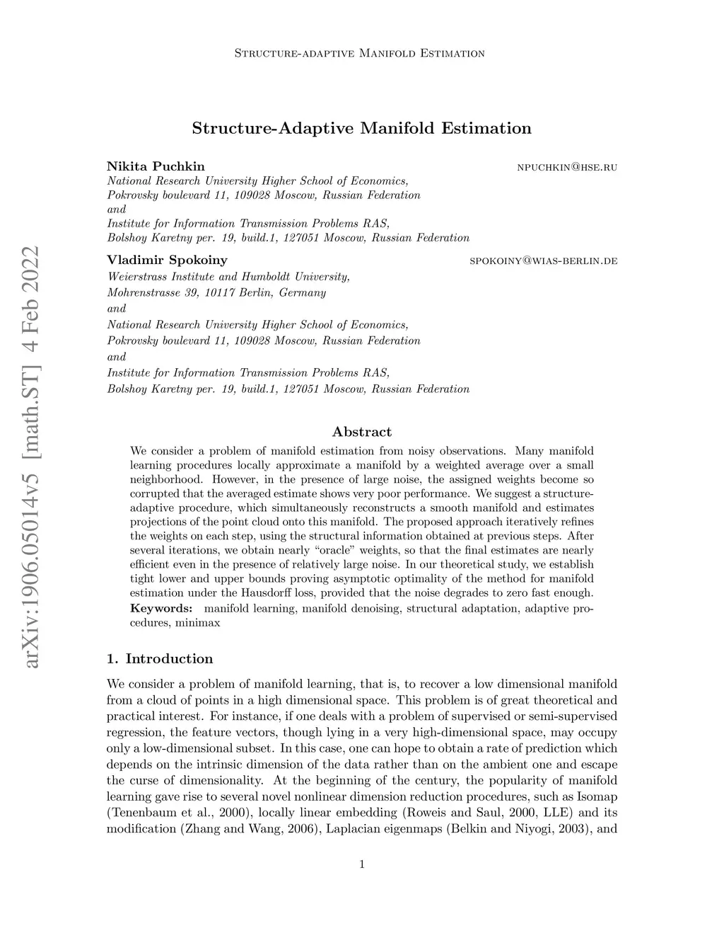 We consider a problem of manifold estimation from noisy observations. We suggest a novel adaptive procedure, which simultaneously reconstructs a smooth manifold from the observations and estimates projectors onto the tangent spaces. Many manifold learning procedures locally approximate a manifold by a weighted average over a small neighborhood. However, in the presence of large noise, the assigned weights become so corrupted that the averaged estimate shows very poor performance. We adjust the weights so they capture the manifold structure better. We propose a computationally efficient procedure, which iteratively refines the weights on each step, such that, after several iterations, we obtain the "oracle" weights, so the quality of the final estimates does not suffer even in the presence of relatively large noise. We also provide a theoretical study of the procedure and prove its optimality deriving both new upper and lower bounds for manifold estimation under the Hausdorff loss.