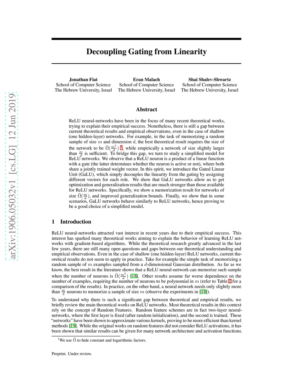 ReLU neural-networks have been in the focus of many recent theoretical works, trying to explain their empirical success. Nonetheless, there is still a gap between current theoretical results and empirical observations, even in the case of shallow (one hidden-layer) networks. For example, in the task of memorizing a random sample of size and dimension , the best theoretical result requires the size of the network to be , while empirically a network of size slightly larger than is sufficient. To bridge this gap, we turn to study a simplified model for ReLU networks. We observe that a ReLU neuron is a product of a linear function with a gate (the latter determines whether the neuron is active or not), where both share a jointly trained weight vector. In this spirit, we introduce the Gated Linear Unit (GaLU), which simply decouples the linearity from the gating by assigning different vectors for each role. We show that GaLU networks allow us to get optimization and generalization results that are much stronger than those available for ReLU networks. Specifically, we show a memorization result for networks of size , and improved generalization bounds. Finally, we show that in some scenarios, GaLU networks behave similarly to ReLU networks, hence proving to be a good choice of a simplified model.