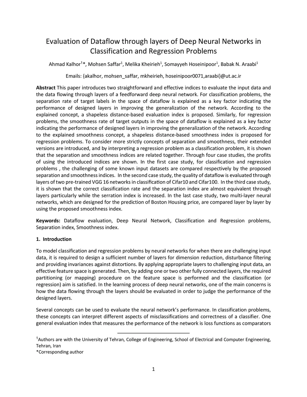 This paper introduces two straightforward, effective indices to evaluate the input data and the data flowing through layers of a feedforward deep neural network. For classification problems, the separation rate of target labels in the space of dataflow is explained as a key factor indicating the performance of designed layers in improving the generalization of the network. According to the explained concept, a shapeless distance-based evaluation index is proposed. Similarly, for regression problems, the smoothness rate of target outputs in the space of dataflow is explained as a key factor indicating the performance of designed layers in improving the generalization of the network. According to the explained smoothness concept, a shapeless distance-based smoothness index is proposed for regression problems. To consider more strictly concepts of separation and smoothness, their extended versions are introduced, and by interpreting a regression problem as a classification problem, it is shown that the separation and smoothness indices are related together. Through four case studies, the profits of using the introduced indices are shown. In the first case study, for classification and regression problems , the challenging of some known input datasets are compared respectively by the proposed separation and smoothness indices. In the second case study, the quality of dataflow is evaluated through layers of two pre-trained VGG 16 networks in classification of Cifar10 and Cifar100. In the third case study, it is shown that the correct classification rate and the separation index are almost equivalent through layers particularly while the serration index is increased. In the last case study, two multi-layer neural networks, which are designed for the prediction of Boston Housing price, are compared layer by layer by using the proposed smoothness index.