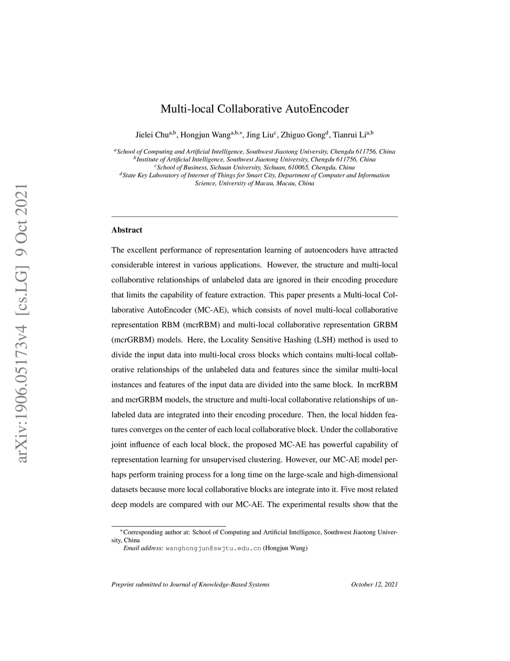 The excellent performance of representation learning of autoencoders have attracted considerable interest in various applications. However, the structure and multi-local collaborative relationships of unlabeled data are ignored in their encoding procedure that limits the capability of feature extraction. This paper presents a Multi-local Collaborative AutoEncoder (MC-AE), which consists of novel multi-local collaborative representation RBM (mcrRBM) and multi-local collaborative representation GRBM (mcrGRBM) models. Here, the Locality Sensitive Hashing (LSH) method is used to divide the input data into multi-local cross blocks which contains multi-local collaborative relationships of the unlabeled data and features since the similar multi-local instances and features of the input data are divided into the same block. In mcrRBM and mcrGRBM models, the structure and multi-local collaborative relationships of unlabeled data are integrated into their encoding procedure. Then, the local hidden features converges on the center of each local collaborative block. Under the collaborative joint influence of each local block, the proposed MC-AE has powerful capability of representation learning for unsupervised clustering. However, our MC-AE model perhaps perform training process for a long time on the large-scale and high-dimensional datasets because more local collaborative blocks are integrate into it. Five most related deep models are compared with our MC-AE. The experimental results show that the proposed MC-AE has more excellent capabilities of collaborative representation and generalization than the contrastive deep models.