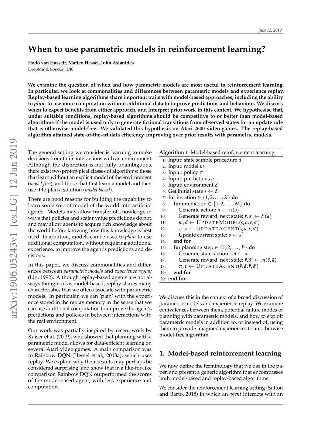 We examine the question of when and how parametric models are most useful in reinforcement learning. In particular, we look at commonalities and differences between parametric models and experience replay. Replay-based learning algorithms share important traits with model-based approaches, including the ability to plan: to use more computation without additional data to improve predictions and behaviour. We discuss when to expect benefits from either approach, and interpret prior work in this context. We hypothesise that, under suitable conditions, replay-based algorithms should be competitive to or better than model-based algorithms if the model is used only to generate fictional transitions from observed states for an update rule that is otherwise model-free. We validated this hypothesis on Atari 2600 video games. The replay-based algorithm attained state-of-the-art data efficiency, improving over prior results with parametric models.