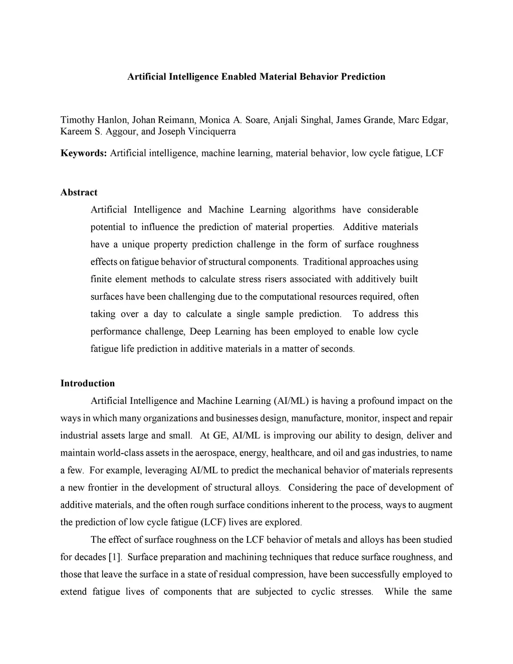 Artificial Intelligence and Machine Learning algorithms have considerable potential to influence the prediction of material properties. Additive materials have a unique property prediction challenge in the form of surface roughness effects on fatigue behavior of structural components. Traditional approaches using finite element methods to calculate stress risers associated with additively built surfaces have been challenging due to the computational resources required, often taking over a day to calculate a single sample prediction. To address this performance challenge, Deep Learning has been employed to enable low cycle fatigue life prediction in additive materials in a matter of seconds.