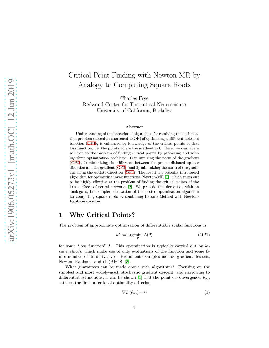 Understanding of the behavior of algorithms for resolving the optimization problem (hereafter shortened to OP) of optimizing a differentiable loss function (OP1), is enhanced by knowledge of the critical points of that loss function, i.e. the points where the gradient is 0. Here, we describe a solution to the problem of finding critical points by proposing and solving three optimization problems: 1) minimizing the norm of the gradient (OP2), 2) minimizing the difference between the pre-conditioned update direction and the gradient (OP3), and 3) minimizing the norm of the gradient along the update direction (OP4). The result is a recently-introduced algorithm for optimizing invex functions, Newton-MR, which turns out to be highly effective at the problem of finding the critical points of the loss surfaces of neural networks. We precede this derivation with an analogous, but simpler, derivation of the nested-optimization algorithm for computing square roots by combining Heron's Method with Newton-Raphson division.