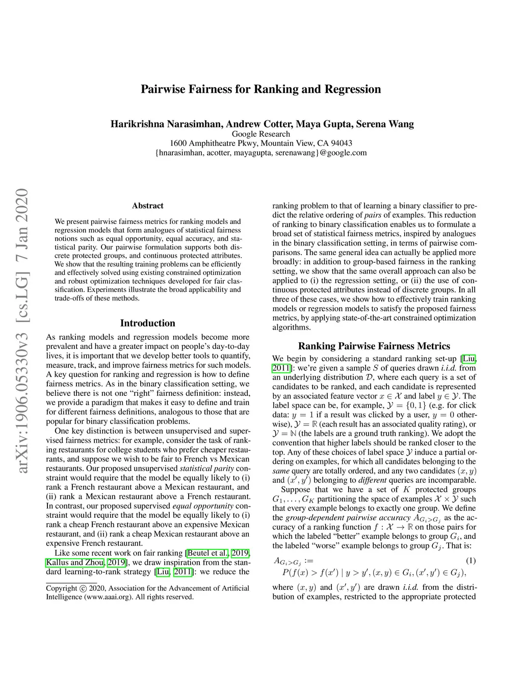 We present pairwise fairness metrics for ranking models and regression models that form analogues of statistical fairness notions such as equal opportunity, equal accuracy, and statistical parity. Our pairwise formulation supports both discrete protected groups, and continuous protected attributes. We show that the resulting training problems can be efficiently and effectively solved using existing constrained optimization and robust optimization techniques developed for fair classification. Experiments illustrate the broad applicability and trade-offs of these methods.