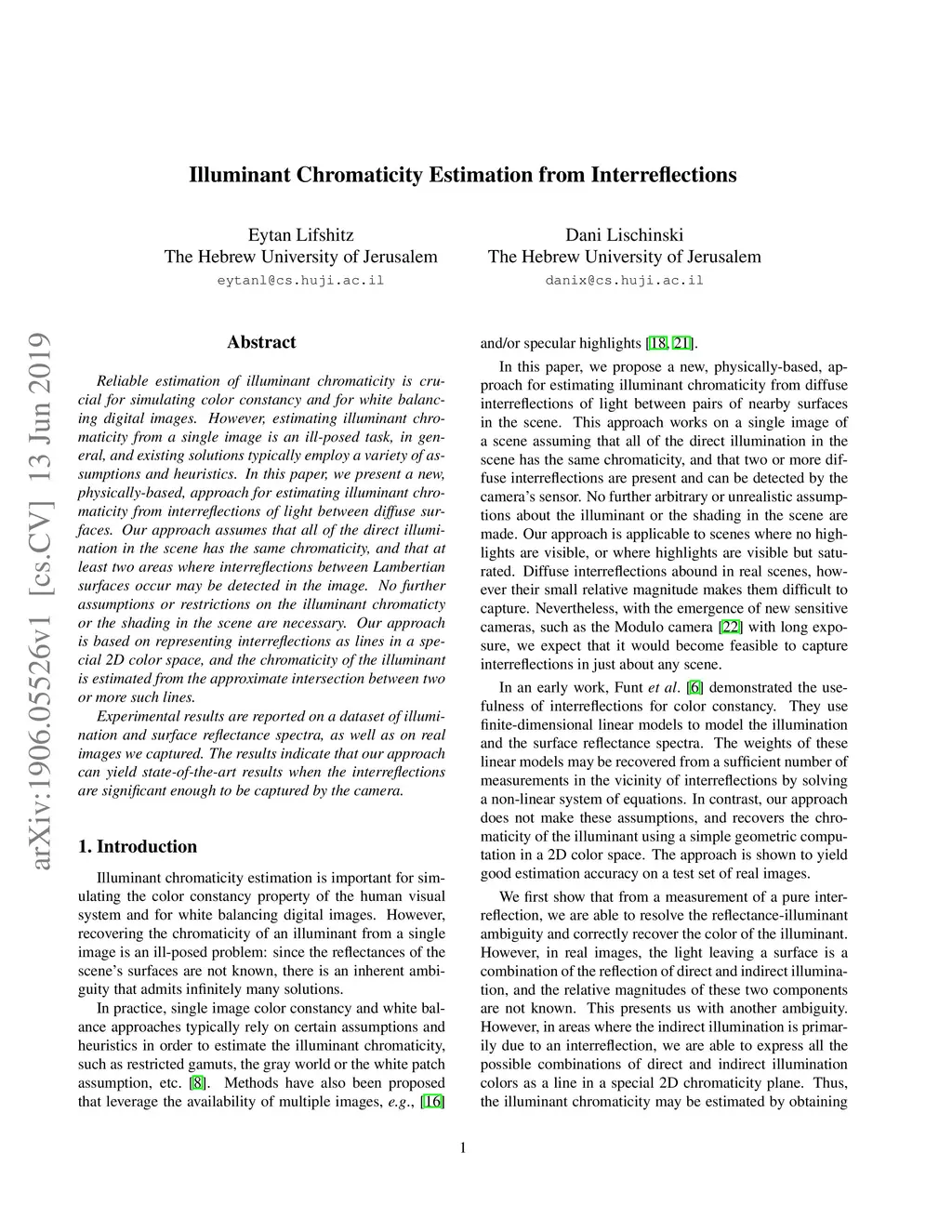 Reliable estimation of illuminant chromaticity is crucial for simulating color constancy and for white balancing digital images. However, estimating illuminant chromaticity from a single image is an ill-posed task, in general, and existing solutions typically employ a variety of assumptions and heuristics. In this paper, we present a new, physically-based, approach for estimating illuminant chromaticity from interreflections of light between diffuse surfaces. Our approach assumes that all of the direct illumination in the scene has the same chromaticity, and that at least two areas where interreflections between Lambertian surfaces occur may be detected in the image. No further assumptions or restrictions on the illuminant chromaticty or the shading in the scene are necessary. Our approach is based on representing interreflections as lines in a special 2D color space, and the chromaticity of the illuminant is estimated from the approximate intersection between two or more such lines. Experimental results are reported on a dataset of illumination and surface reflectance spectra, as well as on real images we captured. The results indicate that our approach can yield state-of-the-art results when the interreflections are significant enough to be captured by the camera.
