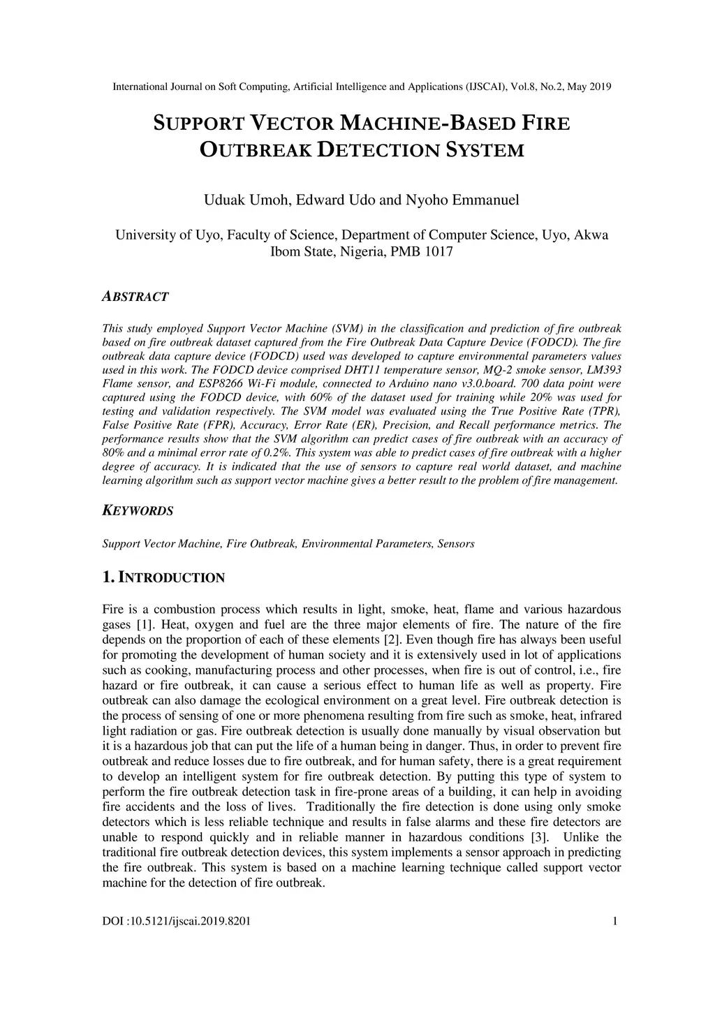 This study employed Support Vector Machine (SVM) in the classification and prediction of fire outbreak based on a fire outbreak dataset captured from the Fire Outbreak Data Capture Device (FODCD). The fire outbreak data capture device (FODCD) used was developed to capture the environmental parameters values used in this work. The FODCD device comprised a DHT11 temperature sensor, MQ-2 smoke sensor, LM393 Flame sensor, and ESP8266 Wi-Fi module, connected to Arduino nano v3.0.board. 700 data point was captured using the FODCD device, with 60% of the dataset used for training while 20% was used for testing and validation respectively. The SVM model was evaluated using the True Positive Rate (TPR), False Positive Rate (FPR), Accuracy, Error Rate (ER), Precision, and Recall performance metrics. The performance results show that the SVM algorithm can predict cases of fire outbreak with an accuracy of 80% and a minimal error rate of 0.2%. This system was able to predict cases of fire outbreak with a higher degree of accuracy. It is indicated that the use of sensors to capture real-world dataset and machine learning algorithm such as the support vector machine gives a better result to the problem of fire management.