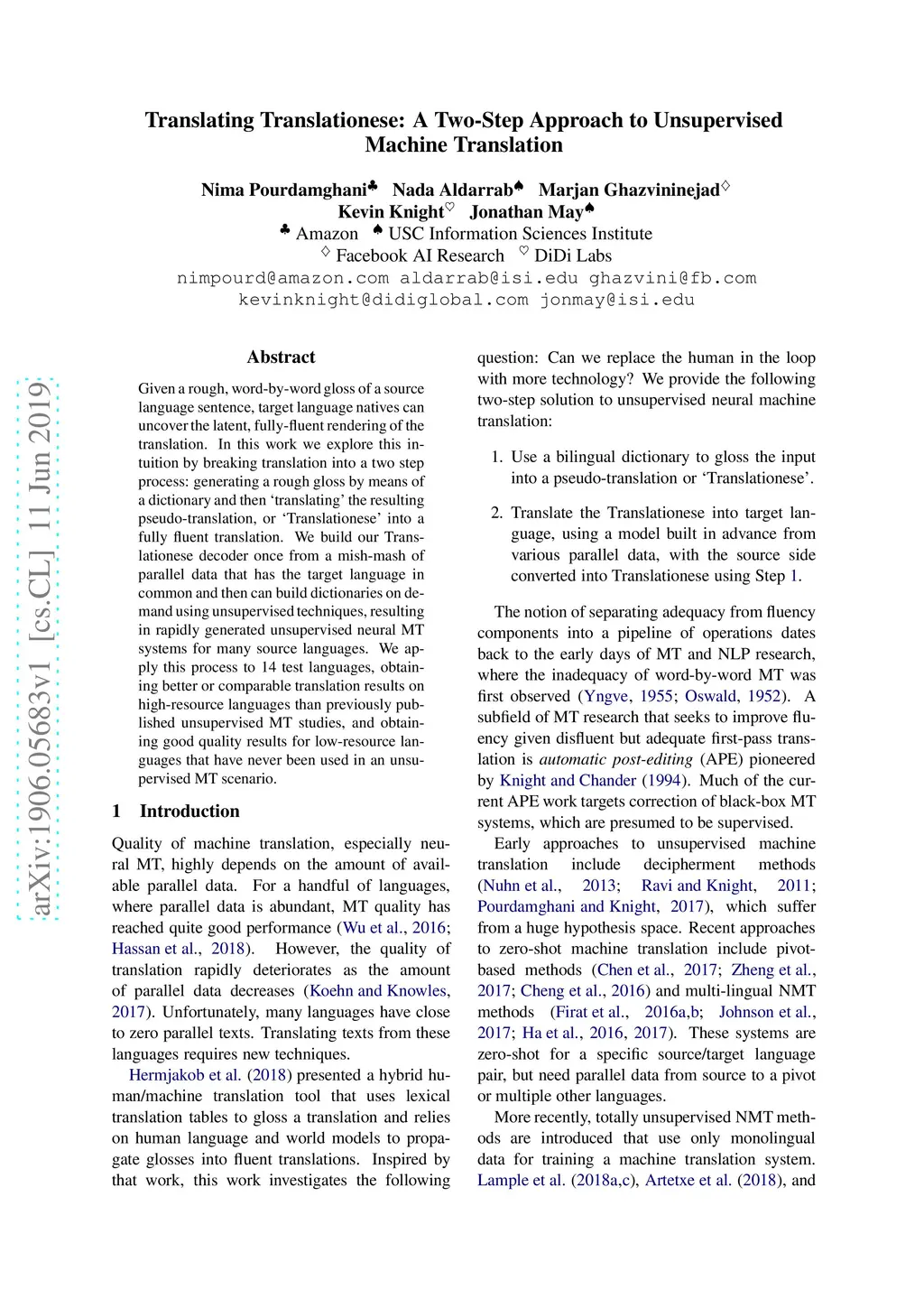 Given a rough, word-by-word gloss of a source language sentence, target language natives can uncover the latent, fully-fluent rendering of the translation. In this work we explore this intuition by breaking translation into a two step process: generating a rough gloss by means of a dictionary and then `translating' the resulting pseudo-translation, or `Translationese' into a fully fluent translation. We build our Translationese decoder once from a mish-mash of parallel data that has the target language in common and then can build dictionaries on demand using unsupervised techniques, resulting in rapidly generated unsupervised neural MT systems for many source languages. We apply this process to 14 test languages, obtaining better or comparable translation results on high-resource languages than previously published unsupervised MT studies, and obtaining good quality results for low-resource languages that have never been used in an unsupervised MT scenario.