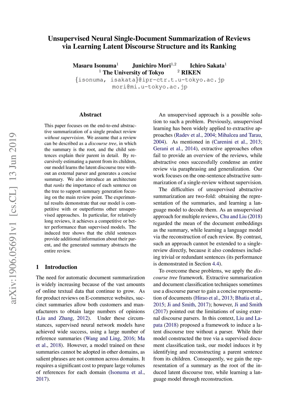 This paper focuses on the end-to-end abstractive summarization of a single product review without supervision. We assume that a review can be described as a discourse tree, in which the summary is the root, and the child sentences explain their parent in detail. By recursively estimating a parent from its children, our model learns the latent discourse tree without an external parser and generates a concise summary. We also introduce an architecture that ranks the importance of each sentence on the tree to support summary generation focusing on the main review point. The experimental results demonstrate that our model is competitive with or outperforms other unsupervised approaches. In particular, for relatively long reviews, it achieves a competitive or better performance than supervised models. The induced tree shows that the child sentences provide additional information about their parent, and the generated summary abstracts the entire review.