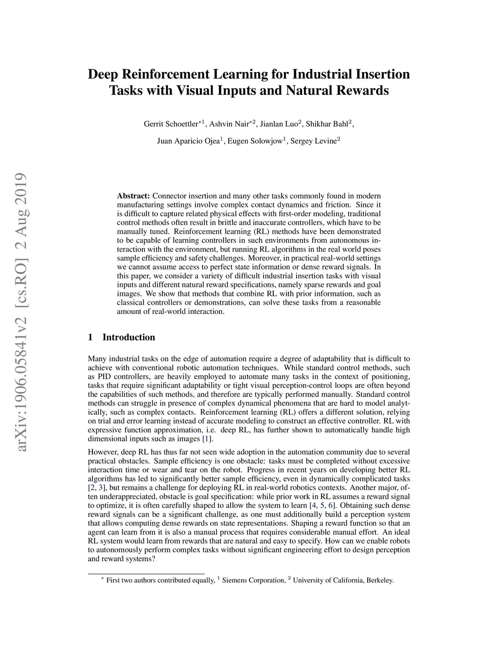 Deep Reinforcement Learning for Industrial Insertion Tasks with Visual