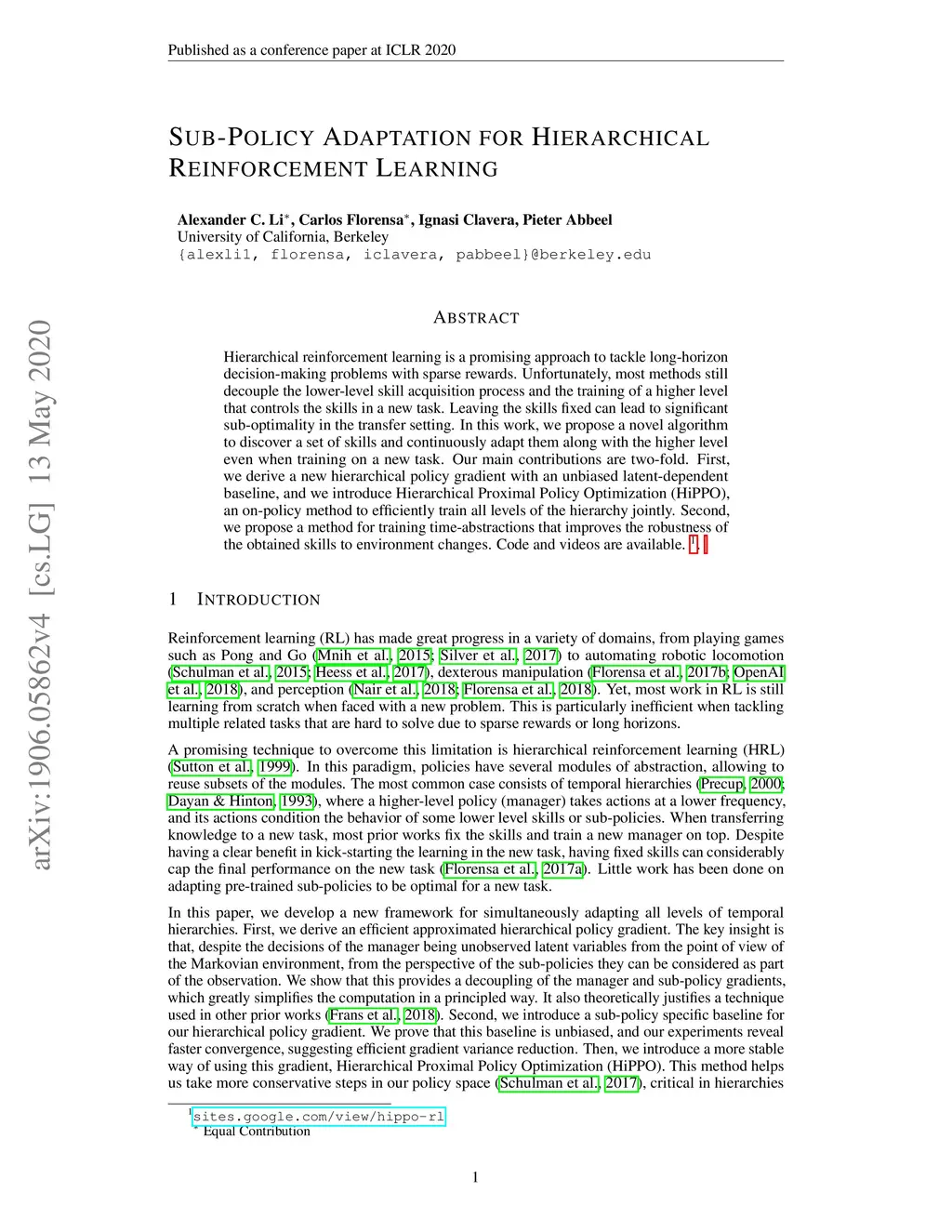 Hierarchical reinforcement learning is a promising approach to tackle long-horizon decision-making problems with sparse rewards. Unfortunately, most methods still decouple the lower-level skill acquisition process and the training of a higher level that controls the skills in a new task. Leaving the skills fixed can lead to significant sub-optimality in the transfer setting. In this work, we propose a novel algorithm to discover a set of skills, and continuously adapt them along with the higher level even when training on a new task. Our main contributions are two-fold. First, we derive a new hierarchical policy gradient with an unbiased latent-dependent baseline, and we introduce Hierarchical Proximal Policy Optimization (HiPPO), an on-policy method to efficiently train all levels of the hierarchy jointly. Second, we propose a method for training time-abstractions that improves the robustness of the obtained skills to environment changes. Code and results are available at sites.google.com/view/hippo-rl
