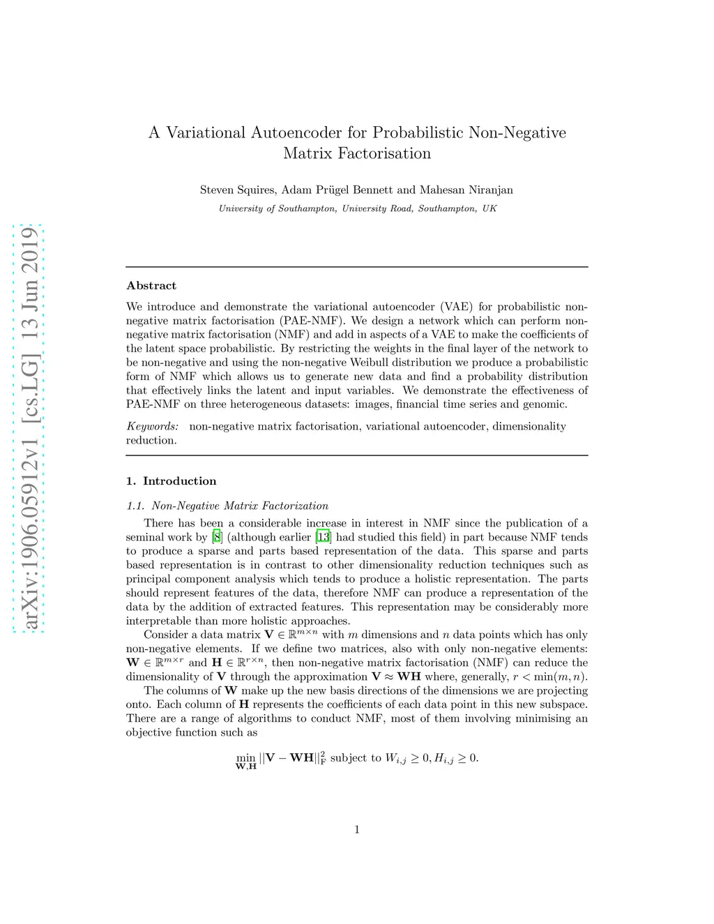 We introduce and demonstrate the variational autoencoder (VAE) for probabilistic non-negative matrix factorisation (PAE-NMF). We design a network which can perform non-negative matrix factorisation (NMF) and add in aspects of a VAE to make the coefficients of the latent space probabilistic. By restricting the weights in the final layer of the network to be non-negative and using the non-negative Weibull distribution we produce a probabilistic form of NMF which allows us to generate new data and find a probability distribution that effectively links the latent and input variables. We demonstrate the effectiveness of PAE-NMF on three heterogeneous datasets: images, financial time series and genomic.