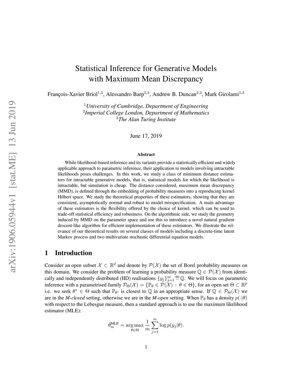 While likelihood-based inference and its variants provide a statistically efficient and widely applicable approach to parametric inference, their application to models involving intractable likelihoods poses challenges. In this work, we study a class of minimum distance estimators for intractable generative models, that is, statistical models for which the likelihood is intractable, but simulation is cheap. The distance considered, maximum mean discrepancy (MMD), is defined through the embedding of probability measures into a reproducing kernel Hilbert space. We study the theoretical properties of these estimators, showing that they are consistent, asymptotically normal and robust to model misspecification. A main advantage of these estimators is the flexibility offered by the choice of kernel, which can be used to trade-off statistical efficiency and robustness. On the algorithmic side, we study the geometry induced by MMD on the parameter space and use this to introduce a novel natural gradient descent-like algorithm for efficient implementation of these estimators. We illustrate the relevance of our theoretical results on several classes of models including a discrete-time latent Markov process and two multivariate stochastic differential equation models.