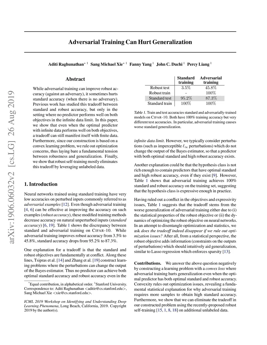 While adversarial training can improve robust accuracy (against an adversary), it sometimes hurts standard accuracy (when there is no adversary). Previous work has studied this tradeoff between standard and robust accuracy, but only in the setting where no predictor performs well on both objectives in the infinite data limit. In this paper, we show that even when the optimal predictor with infinite data performs well on both objectives, a tradeoff can still manifest itself with finite data. Furthermore, since our construction is based on a convex learning problem, we rule out optimization concerns, thus laying bare a fundamental tension between robustness and generalization. Finally, we show that robust self-training mostly eliminates this tradeoff by leveraging unlabeled data.