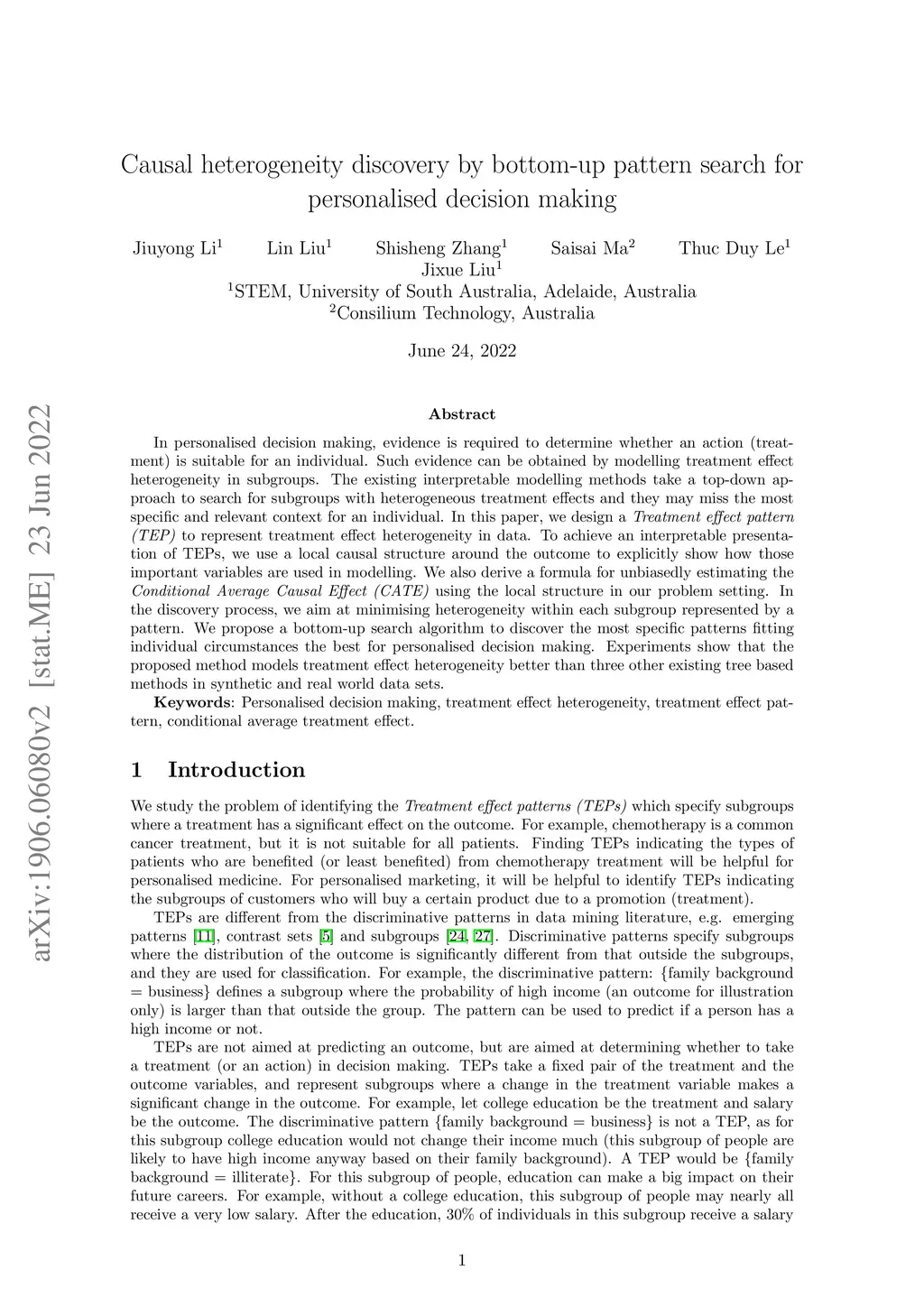 In personalised decision making, evidence is required to determine suitable actions for individuals. Such evidence can be obtained by identifying treatment effect heterogeneity in different subgroups of the population. In this paper, we design a new type of pattern, treatment effect pattern to represent and discover treatment effect heterogeneity from data for determining whether a treatment will work for an individual or not. Our purpose is to use the computational power to find the most specific and relevant conditions for individuals with respect to a treatment or an action to assist with personalised decision making. Most existing work on identifying treatment effect heterogeneity takes a top-down or partitioning based approach to search for subgroups with heterogeneous treatment effects. We propose a bottom-up generalisation algorithm to obtain the most specific patterns that fit individual circumstances the best for personalised decision making. For the generalisation, we follow a consistency driven strategy to maintain inner-group homogeneity and inter-group heterogeneity of treatment effects. We also employ graphical causal modelling technique to identify adjustment variables for reliable treatment effect pattern discovery. Our method can find the treatment effect patterns reliably as validated by the experiments. The method is faster than the two existing machine learning methods for heterogeneous treatment effect identification and it produces subgroups with higher inner-group treatment effect homogeneity.