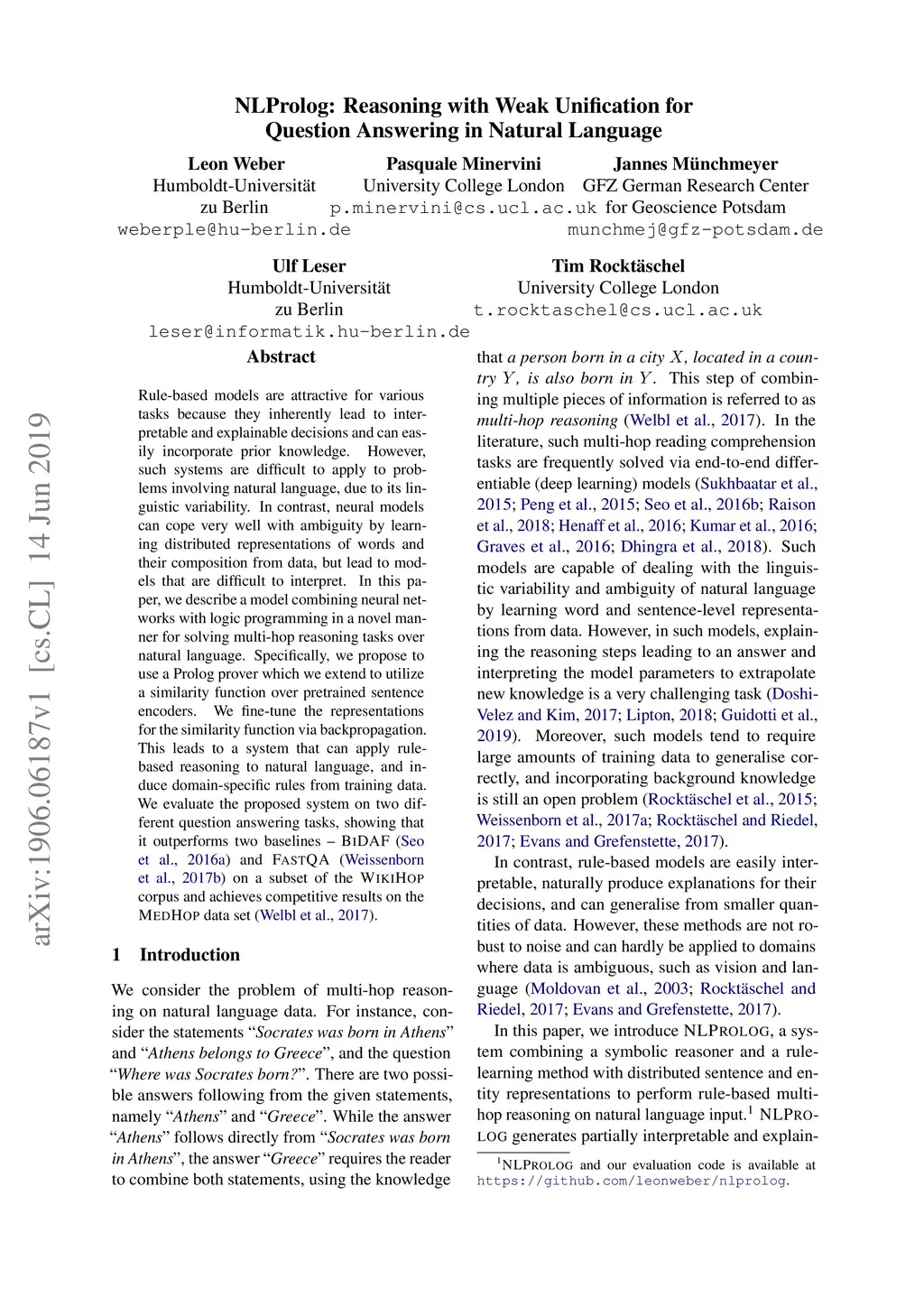 Rule-based models are attractive for various tasks because they inherently lead to interpretable and explainable decisions and can easily incorporate prior knowledge. However, such systems are difficult to apply to problems involving natural language, due to its linguistic variability. In contrast, neural models can cope very well with ambiguity by learning distributed representations of words and their composition from data, but lead to models that are difficult to interpret. In this paper, we describe a model combining neural networks with logic programming in a novel manner for solving multi-hop reasoning tasks over natural language. Specifically, we propose to use a Prolog prover which we extend to utilize a similarity function over pretrained sentence encoders. We fine-tune the representations for the similarity function via backpropagation. This leads to a system that can apply rule-based reasoning to natural language, and induce domain-specific rules from training data. We evaluate the proposed system on two different question answering tasks, showing that it outperforms two baselines -- BIDAF (Seo et al., 2016a) and FAST QA (Weissenborn et al., 2017b) on a subset of the WikiHop corpus and achieves competitive results on the MedHop data set (Welbl et al., 2017).