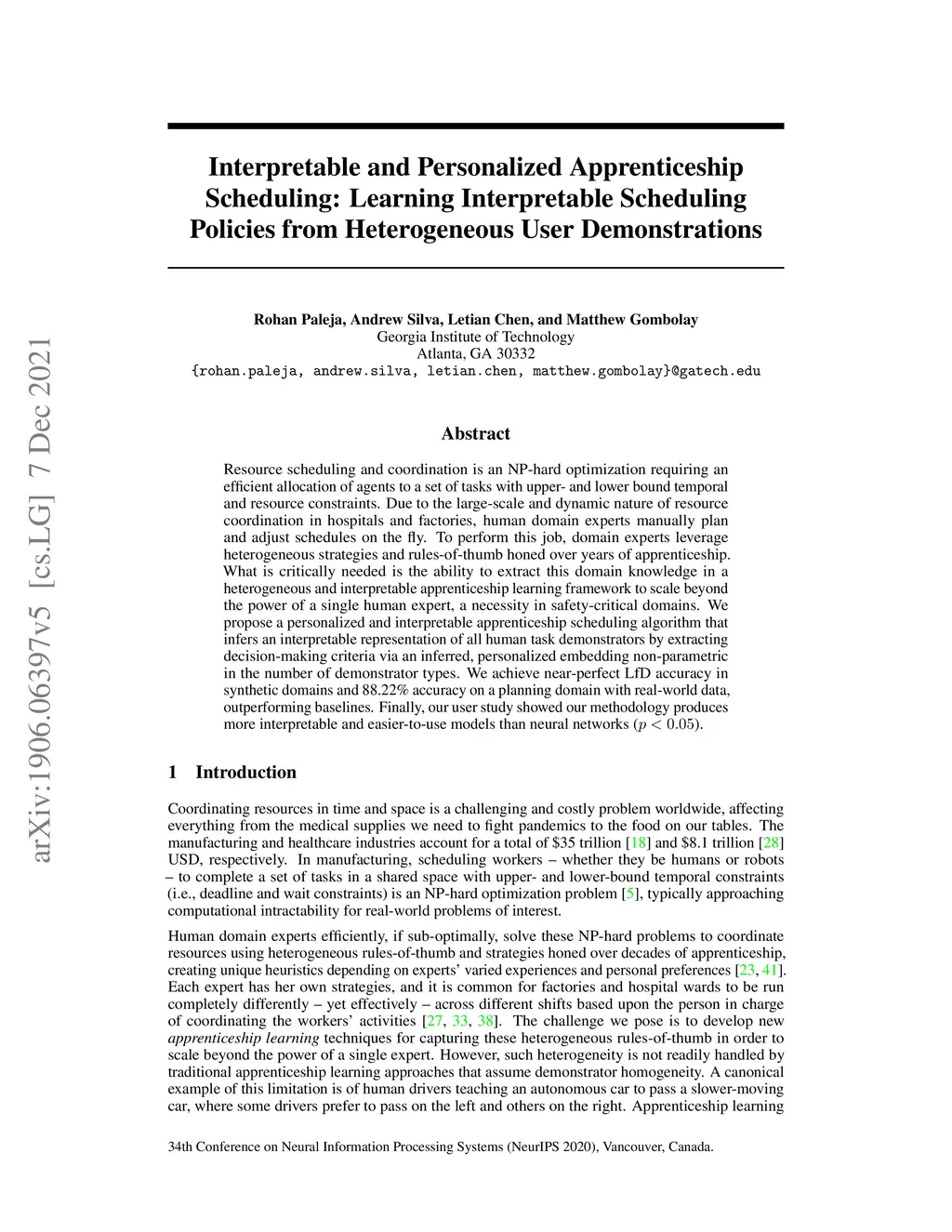 Resource scheduling and coordination is an NP-hard optimization requiring an efficient allocation of agents to a set of tasks with upper- and lower bound temporal and resource constraints. Due to the large-scale and dynamic nature of resource coordination in hospitals and factories, human domain experts manually plan and adjust schedules on the fly. To perform this job, domain experts leverage heterogeneous strategies and rules-of-thumb honed over years of apprenticeship. What is critically needed is the ability to extract this domain knowledge in a heterogeneous and interpretable apprenticeship learning framework to scale beyond the power of a single human expert, a necessity in safety-critical domains. We propose a personalized and interpretable apprenticeship scheduling algorithm that infers an interpretable representation of all human task demonstrators by extracting decision-making criteria via an inferred, personalized embedding non-parametric in the number of demonstrator types. We achieve near-perfect LfD accuracy in synthetic domains and 88.22\% accuracy on a planning domain with real-world, outperforming baselines. Finally, our user study showed our methodology produces more interpretable and easier-to-use models than neural networks ().