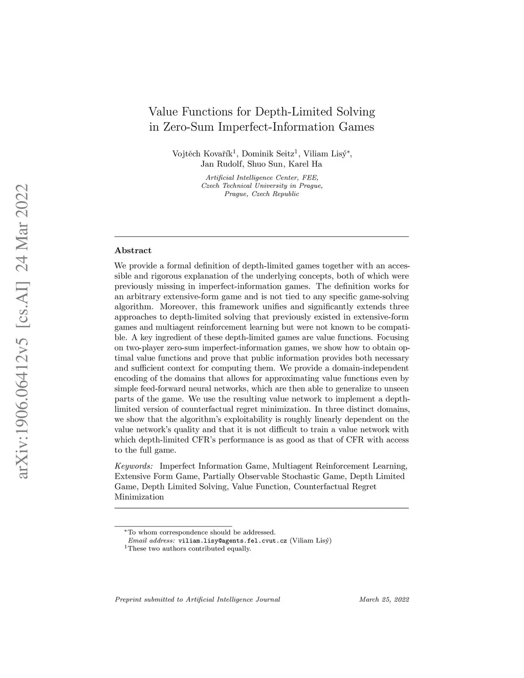 We provide a formal definition of depth-limited games together with an accessible and rigorous explanation of the underlying concepts, both of which were previously missing in imperfect-information games. The definition works for an arbitrary extensive-form game and is not tied to any specific game-solving algorithm. Moreover, this framework unifies and significantly extends three approaches to depth-limited solving that previously existed in extensive-form games and multiagent reinforcement learning but were not known to be compatible. A key ingredient of these depth-limited games are value functions. Focusing on two-player zero-sum imperfect-information games, we show how to obtain optimal value functions and prove that public information provides both necessary and sufficient context for computing them. We provide a domain-independent encoding of the domains that allows for approximating value functions even by simple feed-forward neural networks, which are then able to generalize to unseen parts of the game. We use the resulting value network to implement a depth-limited version of counterfactual regret minimization. In three distinct domains, we show that the algorithm's exploitability is roughly linearly dependent on the value network's quality and that it is not difficult to train a value network with which depth-limited CFR's performance is as good as that of CFR with access to the full game.