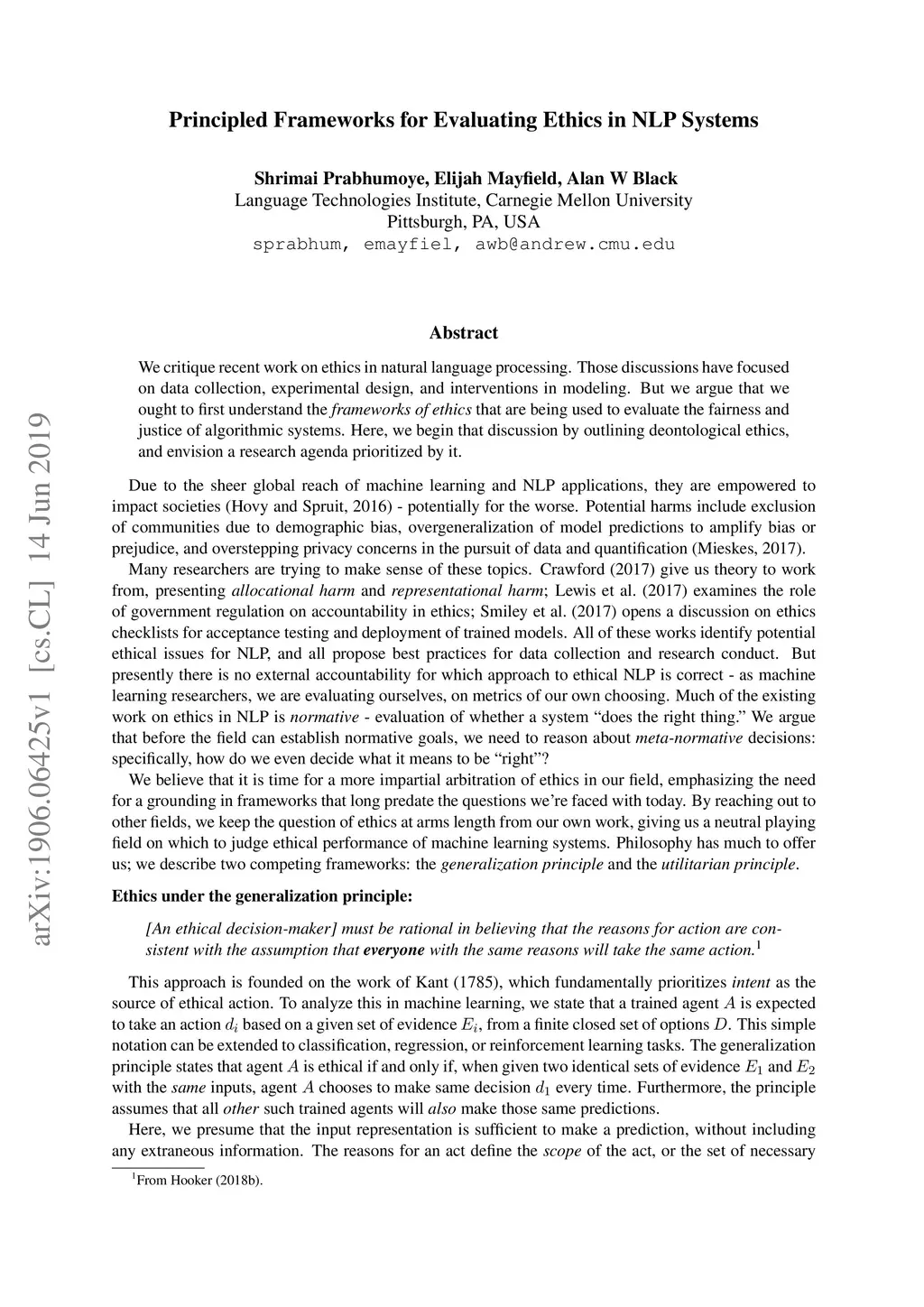 We critique recent work on ethics in natural language processing. Those discussions have focused on data collection, experimental design, and interventions in modeling. But we argue that we ought to first understand the frameworks of ethics that are being used to evaluate the fairness and justice of algorithmic systems. Here, we begin that discussion by outlining deontological ethics, and envision a research agenda prioritized by it.