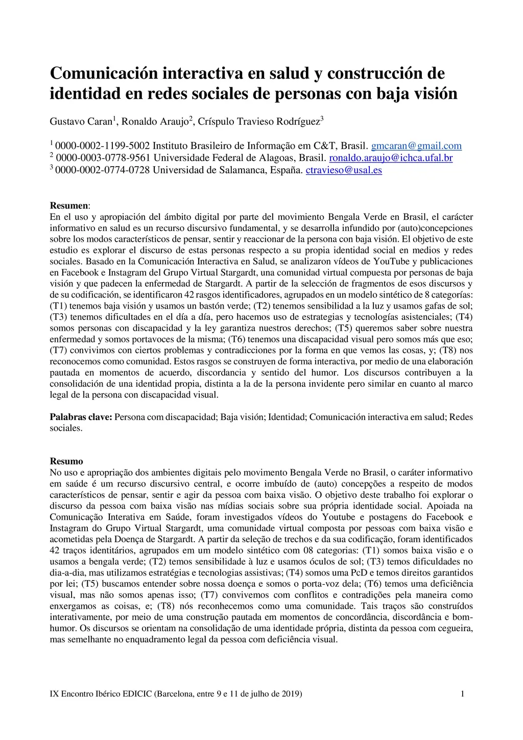With use and appropriation of digital environments by the Green Cane movement in Brazil, the informational character in health is a central discursive resource, and occurs imbued with (self) conceptions about the characteristic ways of thinking, feeling and acting of the person with low vision. This work aims at exploring the discourse of the person with low vision in the social media about their own social identity. Based on the Interactive Health Communication, videos on Youtube and Facebook and Instagram posts of the Virtual Group Stargardt, a virtual community made up of people with low vision and suffering from Stargardt's Disease, were investigated. From the selection of excerpts and their coding, 42 identity traits were identified and grouped into a synthetic model with 08 categories: (T1) we are low vision and we use the green cane; (T2) we have sensitivity to light and we wear sunglasses; (T3) we have difficulties in the day-to-day, but we use assistive strategies and technologies; (T4) we are a PcD (Person with Disability) and we have rights guaranteed by law; (T5) we seek to understand about our disease and we are the spokesperson of it; (T6) we have a visual impairment, but we are not just that; (T7) we live with conflicts and contradictions by the way we see things, and; (T8) we recognize as a community. Such traits are constructed interactively, through a construction based on moments of agreement, disagreement and good humor. The discourses are oriented in the consolidation of a proper identity, distinct from the person with blindness, but similar in the legal framework of the visually impaired person.