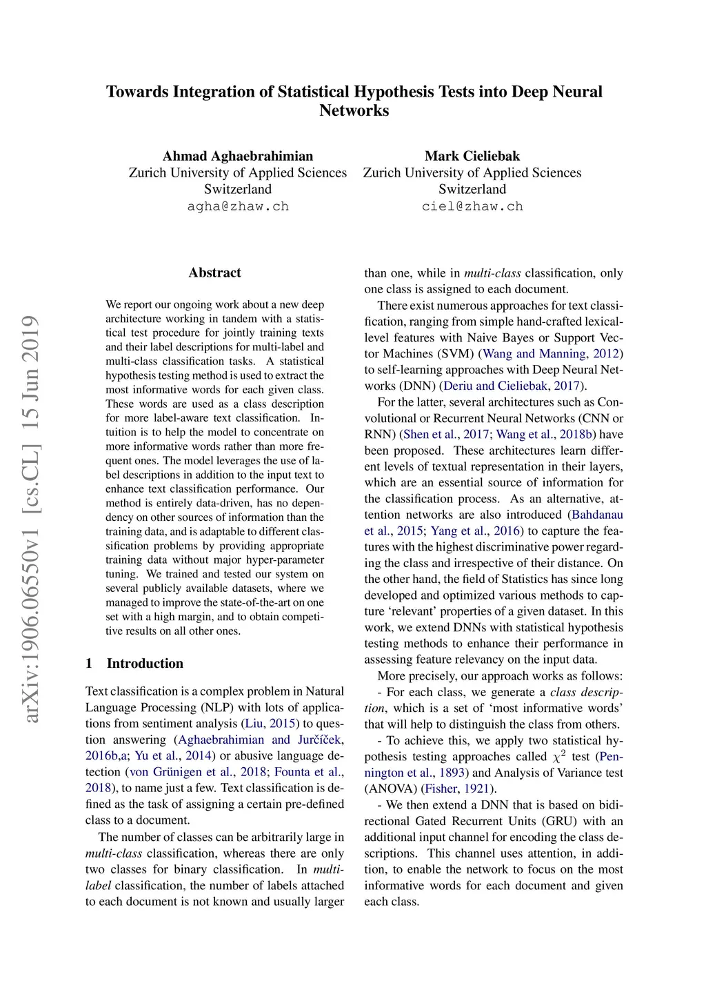 We report our ongoing work about a new deep architecture working in tandem with a statistical test procedure for jointly training texts and their label descriptions for multi-label and multi-class classification tasks. A statistical hypothesis testing method is used to extract the most informative words for each given class. These words are used as a class description for more label-aware text classification. Intuition is to help the model to concentrate on more informative words rather than more frequent ones. The model leverages the use of label descriptions in addition to the input text to enhance text classification performance. Our method is entirely data-driven, has no dependency on other sources of information than the training data, and is adaptable to different classification problems by providing appropriate training data without major hyper-parameter tuning. We trained and tested our system on several publicly available datasets, where we managed to improve the state-of-the-art on one set with a high margin, and to obtain competitive results on all other ones.