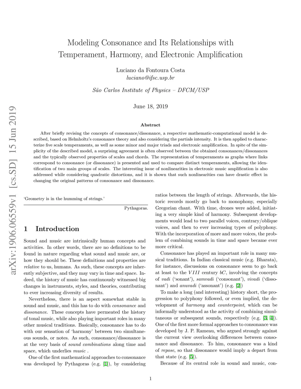 After briefly revising the concepts of consonance/dissonance, a respective mathematic-computational model is described, based on Helmholtz's consonance theory and also considering the partials intensity. It is then applied to characterize five scale temperaments, as well as some minor and major triads and electronic amplification. In spite of the simplicity of the described model, a surprising agreement is often observed between the obtained consonances/dissonances and the typically observed properties of scales and chords. The representation of temperaments as graphs where links correspond to consonance (or dissonance) is presented and used to compare distinct temperaments, allowing the identification of two main groups of scales. The interesting issue of nonlinearities in electronic music amplification is also addressed while considering quadratic distortions, and it is shown that such nonlinearities can have drastic effect in changing the original patterns of consonance and dissonance.