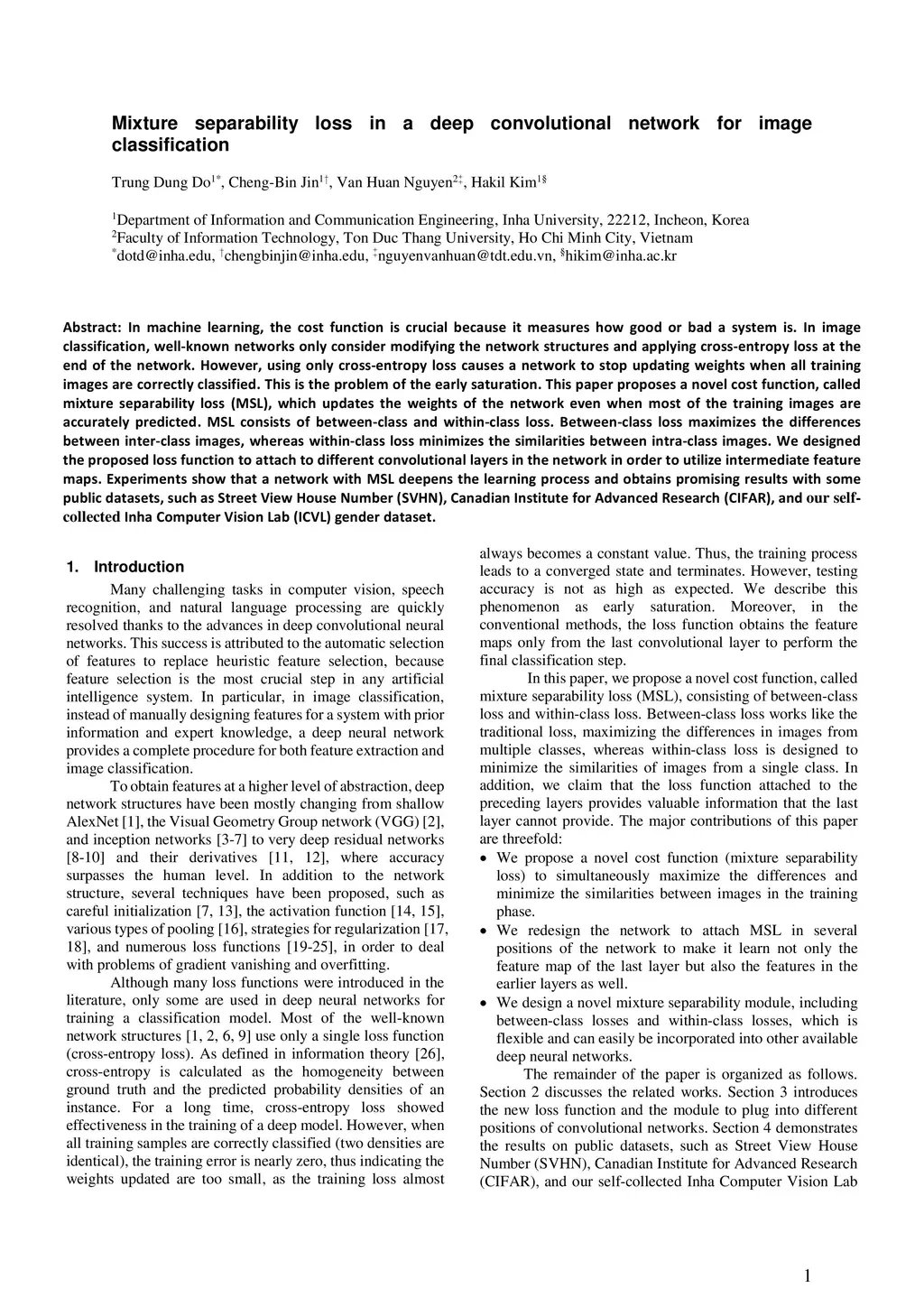In machine learning, the cost function is crucial because it measures how good or bad a system is. In image classification, well-known networks only consider modifying the network structures and applying cross-entropy loss at the end of the network. However, using only cross-entropy loss causes a network to stop updating weights when all training images are correctly classified. This is the problem of the early saturation. This paper proposes a novel cost function, called mixture separability loss (MSL), which updates the weights of the network even when most of the training images are accurately predicted. MSL consists of between-class and within-class loss. Between-class loss maximizes the differences between inter-class images, whereas within-class loss minimizes the similarities between intra-class images. We designed the proposed loss function to attach to different convolutional layers in the network in order to utilize intermediate feature maps. Experiments show that a network with MSL deepens the learning process and obtains promising results with some public datasets, such as Street View House Number (SVHN), Canadian Institute for Advanced Research (CIFAR), and our self-collected Inha Computer Vision Lab (ICVL) gender dataset.