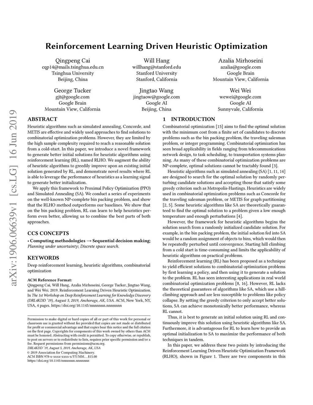 Heuristic algorithms such as simulated annealing, Concorde, and METIS are effective and widely used approaches to find solutions to combinatorial optimization problems. However, they are limited by the high sample complexity required to reach a reasonable solution from a cold-start. In this paper, we introduce a novel framework to generate better initial solutions for heuristic algorithms using reinforcement learning (RL), named RLHO. We augment the ability of heuristic algorithms to greedily improve upon an existing initial solution generated by RL, and demonstrate novel results where RL is able to leverage the performance of heuristics as a learning signal to generate better initialization. We apply this framework to Proximal Policy Optimization (PPO) and Simulated Annealing (SA). We conduct a series of experiments on the well-known NP-complete bin packing problem, and show that the RLHO method outperforms our baselines. We show that on the bin packing problem, RL can learn to help heuristics perform even better, allowing us to combine the best parts of both approaches.