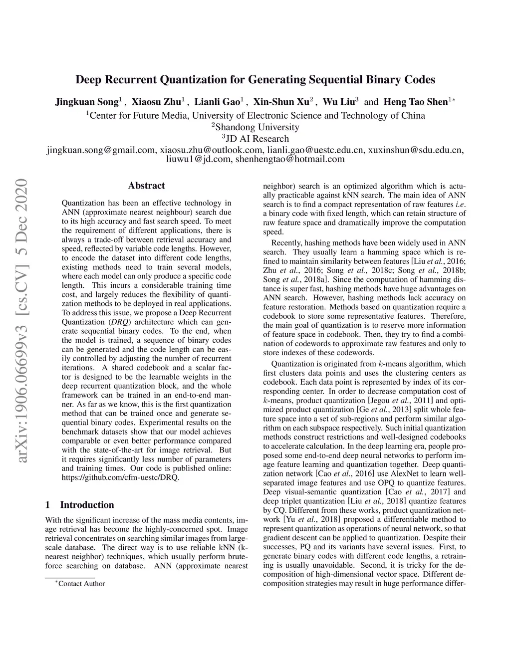 Deep Recurrent Quantization for Generating Sequential Binary Codes