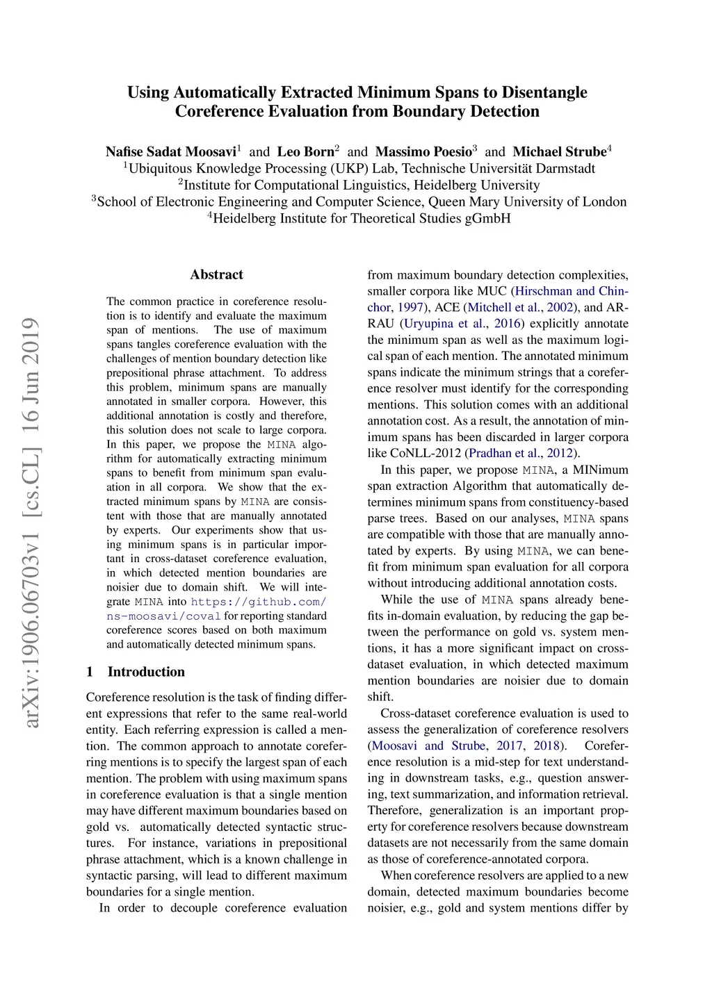 The common practice in coreference resolution is to identify and evaluate the maximum span of mentions. The use of maximum spans tangles coreference evaluation with the challenges of mention boundary detection like prepositional phrase attachment. To address this problem, minimum spans are manually annotated in smaller corpora. However, this additional annotation is costly and therefore, this solution does not scale to large corpora. In this paper, we propose the MINA algorithm for automatically extracting minimum spans to benefit from minimum span evaluation in all corpora. We show that the extracted minimum spans by MINA are consistent with those that are manually annotated by experts. Our experiments show that using minimum spans is in particular important in cross-dataset coreference evaluation, in which detected mention boundaries are noisier due to domain shift. We will integrate MINA into https://github.com/ns-moosavi/coval for reporting standard coreference scores based on both maximum and automatically detected minimum spans.