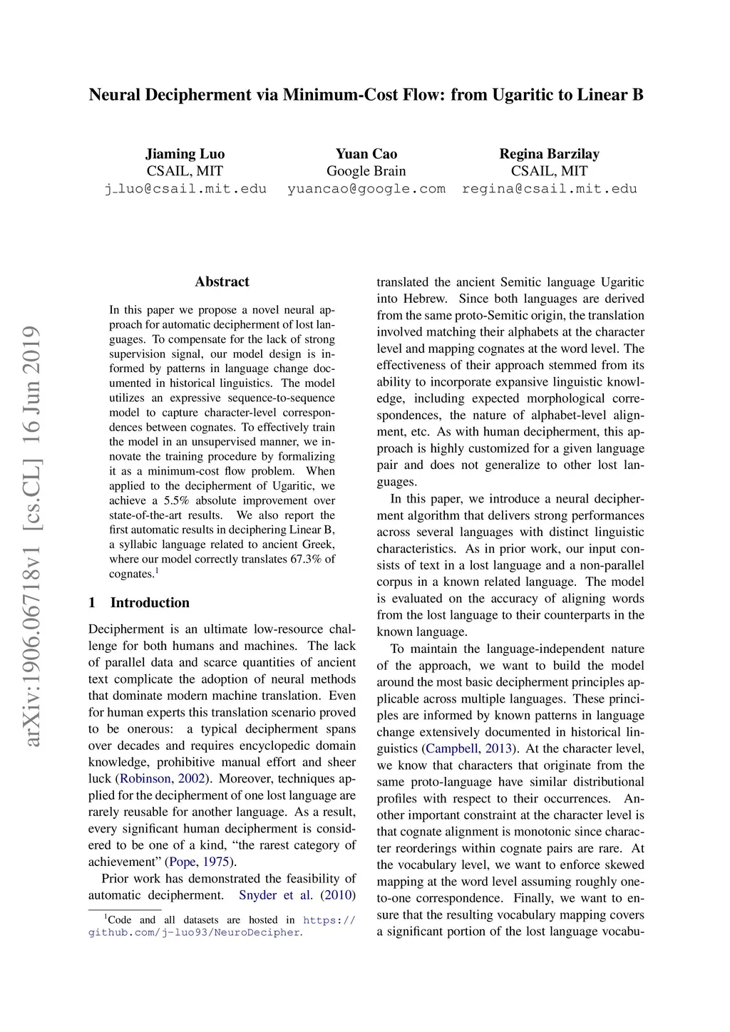Neural Decipherment via Minimum-Cost Flow: from Ugaritic to Linear B