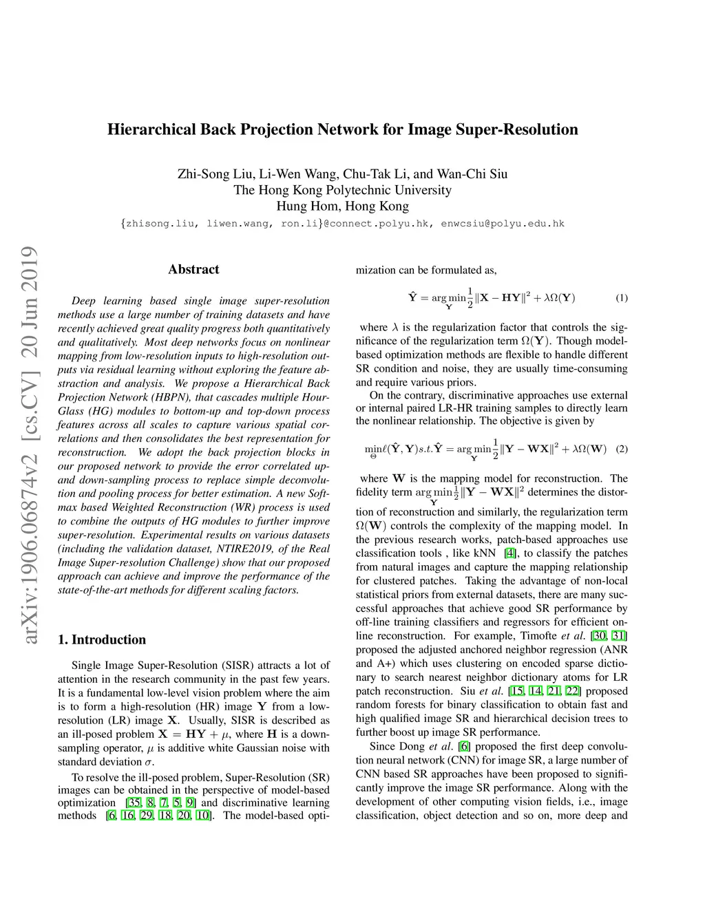 Deep learning based single image super-resolution methods use a large number of training datasets and have recently achieved great quality progress both quantitatively and qualitatively. Most deep networks focus on nonlinear mapping from low-resolution inputs to high-resolution outputs via residual learning without exploring the feature abstraction and analysis. We propose a Hierarchical Back Projection Network (HBPN), that cascades multiple HourGlass (HG) modules to bottom-up and top-down process features across all scales to capture various spatial correlations and then consolidates the best representation for reconstruction. We adopt the back projection blocks in our proposed network to provide the error correlated up and down-sampling process to replace simple deconvolution and pooling process for better estimation. A new Softmax based Weighted Reconstruction (WR) process is used to combine the outputs of HG modules to further improve super-resolution. Experimental results on various datasets (including the validation dataset, NTIRE2019, of the Real Image Super-resolution Challenge) show that our proposed approach can achieve and improve the performance of the state-of-the-art methods for different scaling factors.