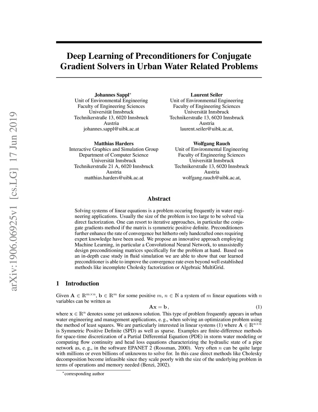 Solving systems of linear equations is a problem occuring frequently in water engineering applications. Usually the size of the problem is too large to be solved via direct factorization. One can resort to iterative approaches, in particular the conjugate gradients method if the matrix is symmetric positive definite. Preconditioners further enhance the rate of convergence but hitherto only handcrafted ones requiring expert knowledge have been used. We propose an innovative approach employing Machine Learning, in particular a Convolutional Neural Network, to unassistedly design preconditioning matrices specifically for the problem at hand. Based on an in-depth case study in fluid simulation we are able to show that our learned preconditioner is able to improve the convergence rate even beyond well established methods like incomplete Cholesky factorization or Algebraic MultiGrid.